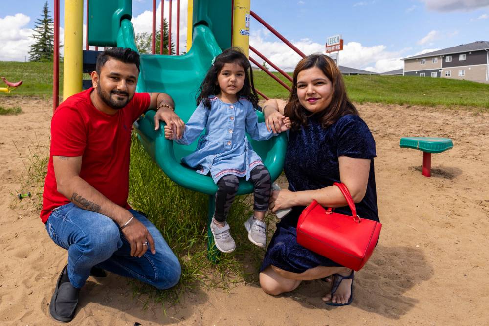 Sagar Jethva, left, Jalpa Vaja and Vainavi Jethva, 3, visit the North Hill playground Tuesday. The couple moved from India to Brandon but their daughter was born in Canada.
