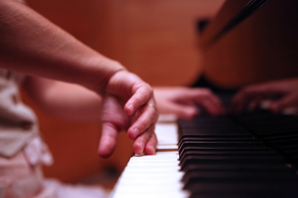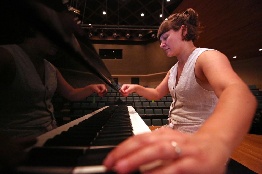 Winnipeg pianist Madeline Hildebrand runs her fingers down the keys during a practice of La Valse by Maurice Ravel on Monday afternoon with fellow pianist Everett Hopfner, in advance of this evening's Augustfest performance at Brandon University's Lorne Watson Recital Hall. The performance begins at 7:30 p.m. and is $40 at the door. For more information on this year’s concert series, visit augustfest.ca. (Matt Goerzen/The Brandon Sun)