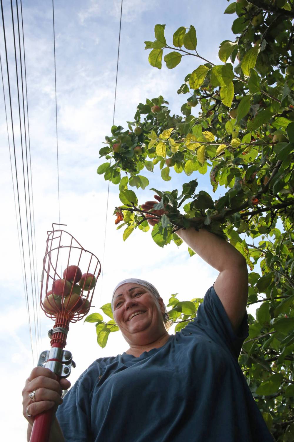 In a yard on Queens Avenue, a pair of pickers look up to the tree tops, searching the higher limbs for apples that they haven’t already managed to reach.