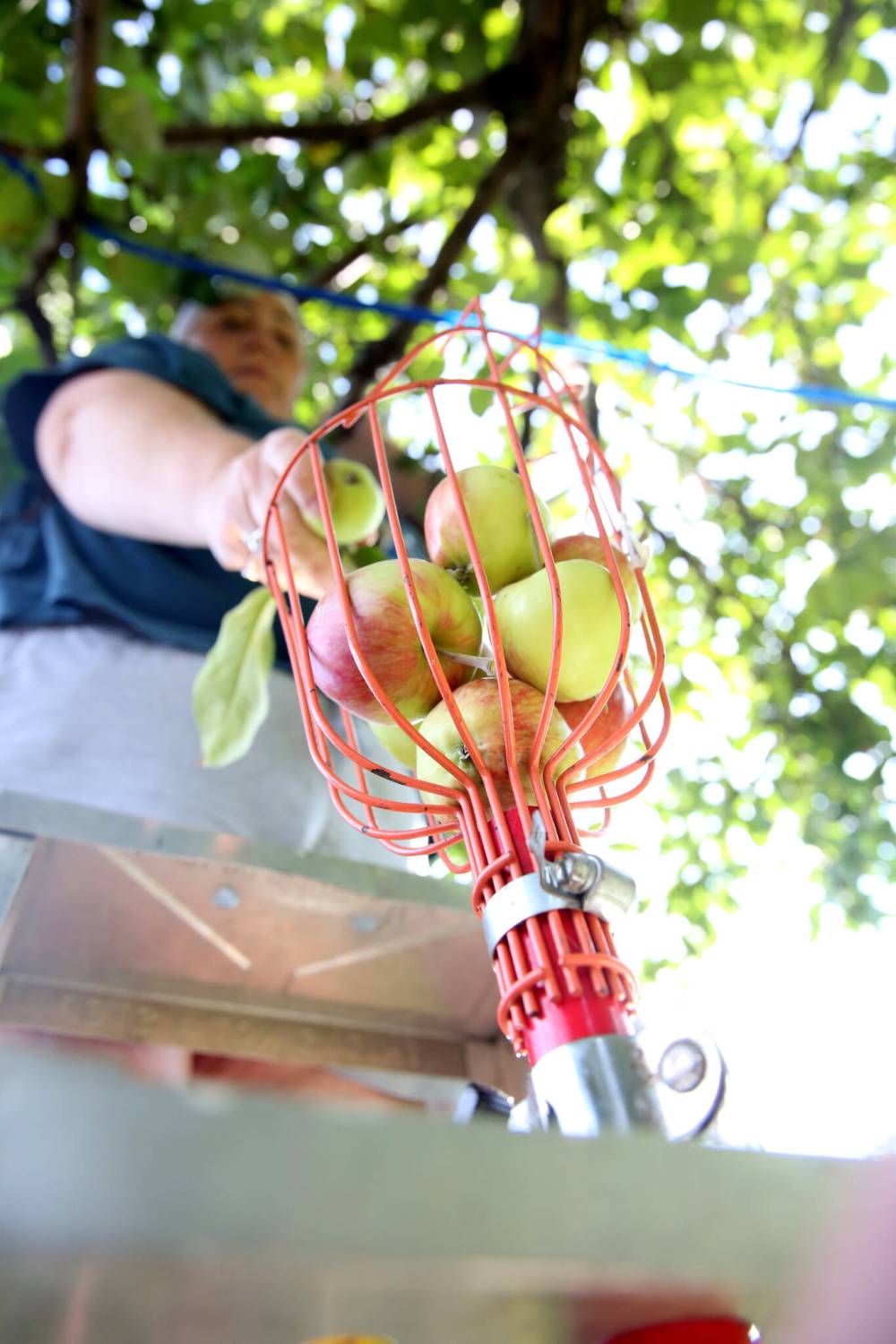 One of them is atop a step ladder, the other on the ground — both are using a special fruit-gathering tool with an extended handle that allows the pickers to reach distant branches.