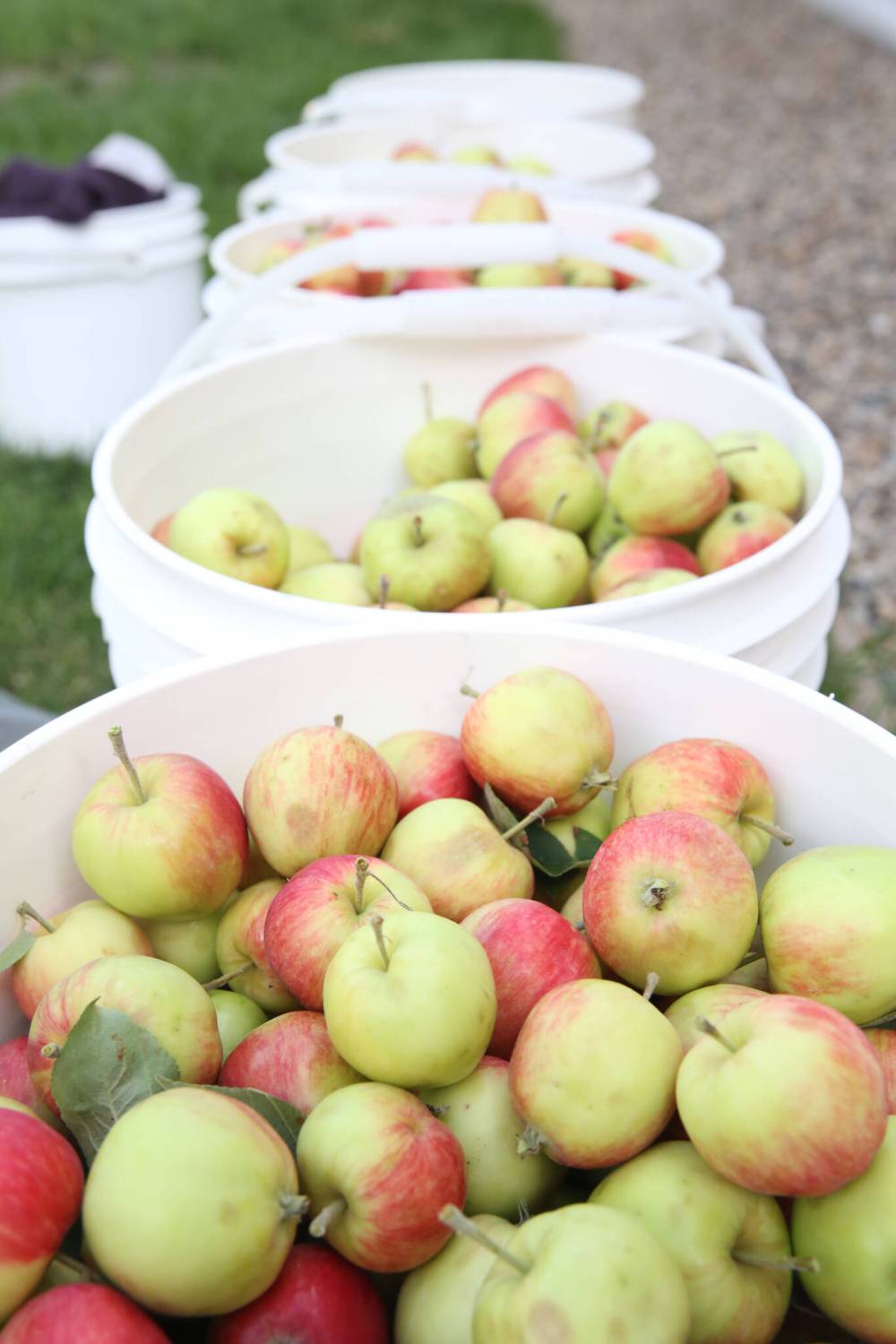 Several buckets of ripened apples line the ground near the tree before being taken way.