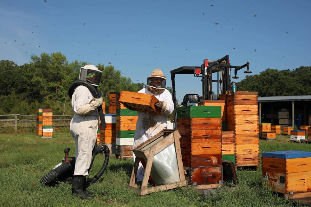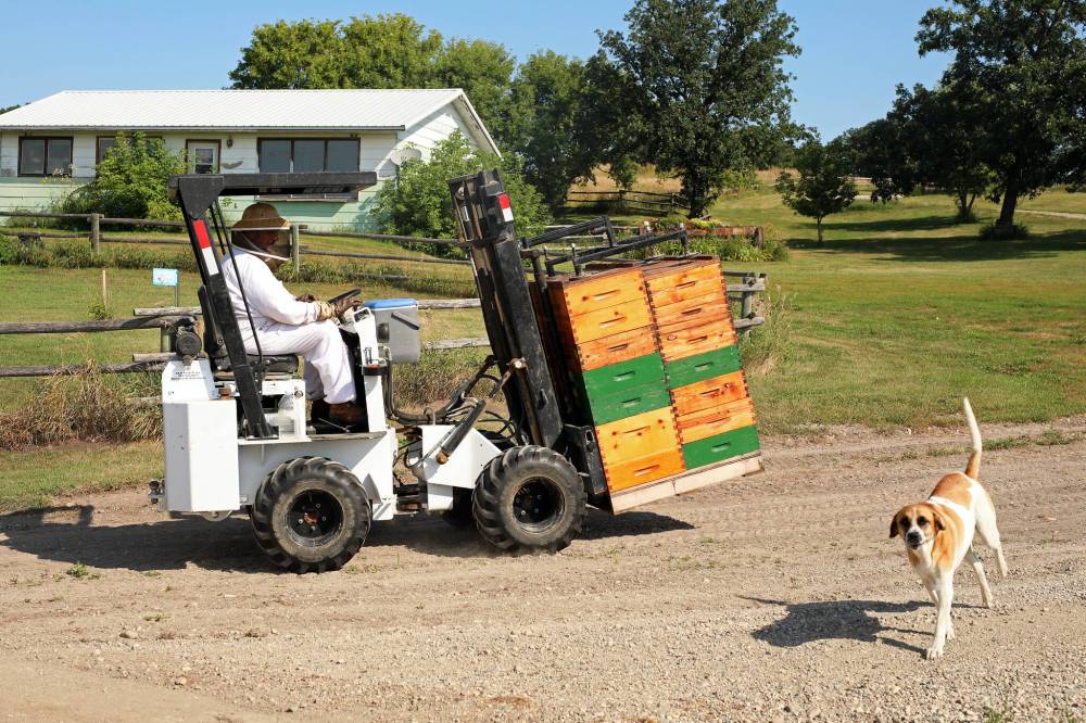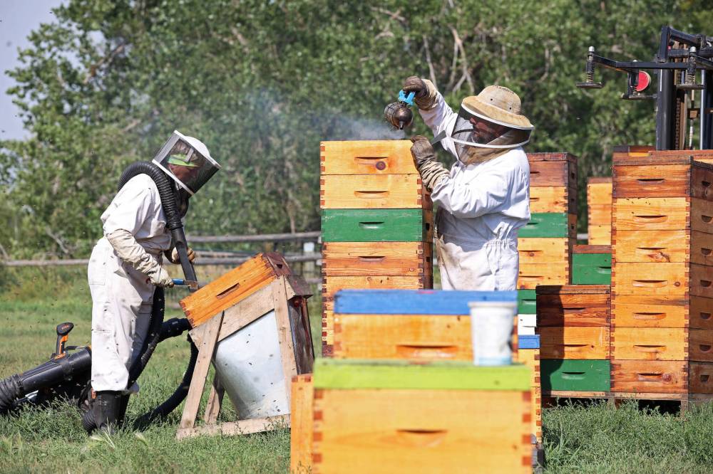 The Vander Veldes collect boxes full of frames containing honeycomb from their beehives, so they can extract the honey at their farm, southwest of Rivers on Monday. (Tim Smith/The Brandon Sun)