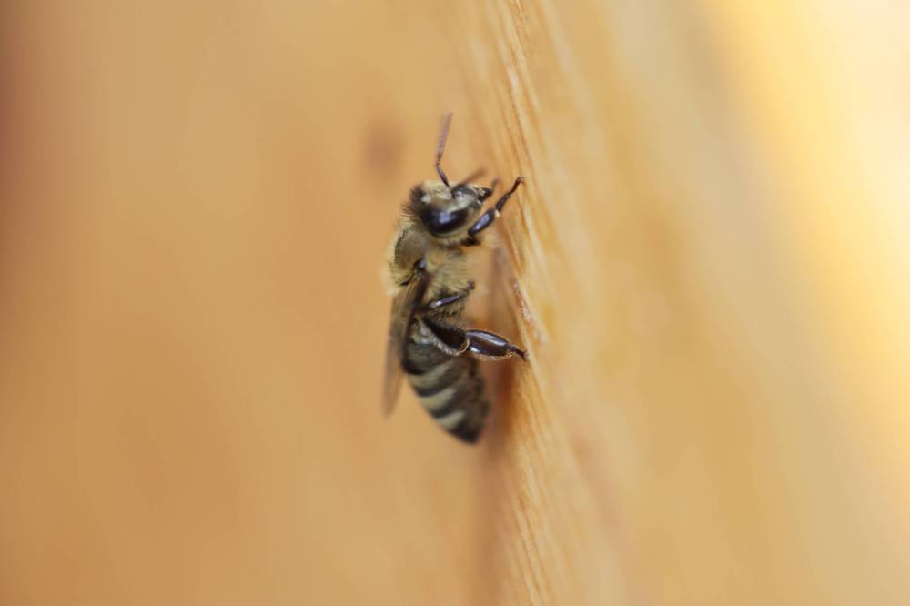 A honey bee sits on a box at the Vander Velde farm southwest of Rivers on Tuesday. (Tim Smith/The Brandon Sun)