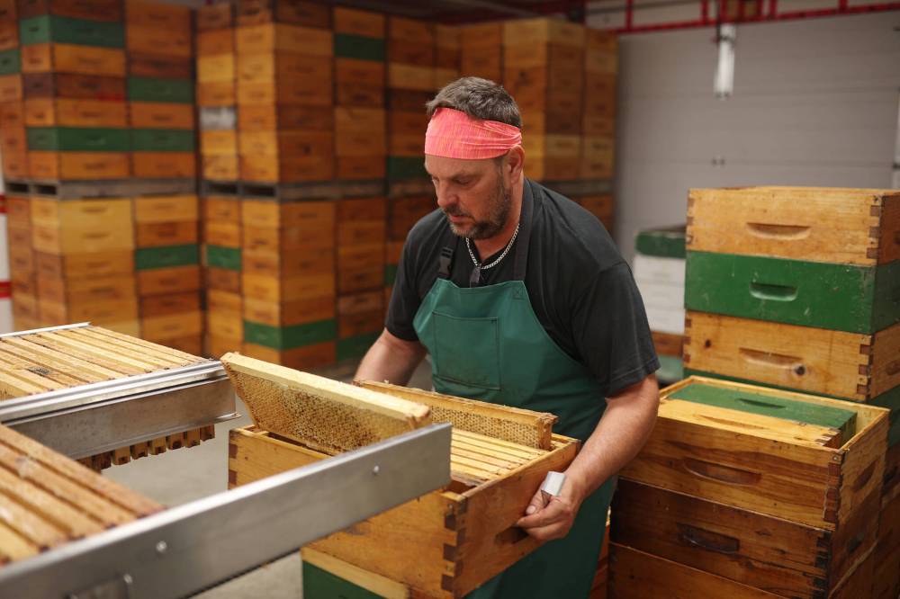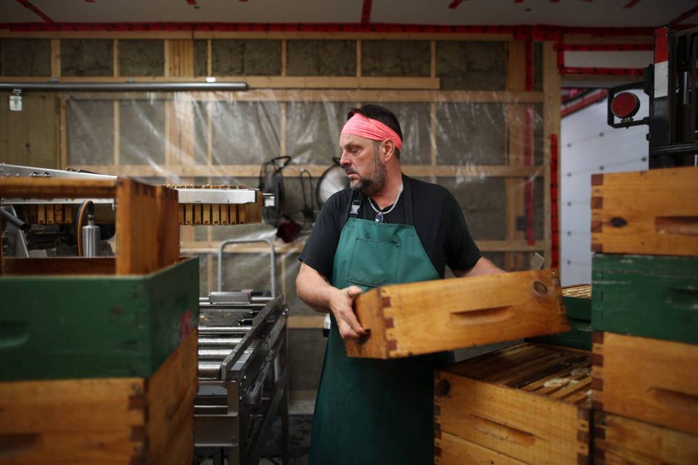 Andrew puts recently extracted frames back into boxes for next year on his family’s farm, southwest of Rivers on Tuesday. (Tim Smith/The Brandon Sun)