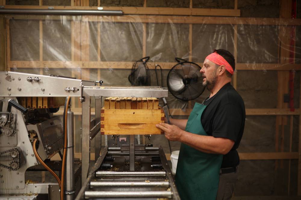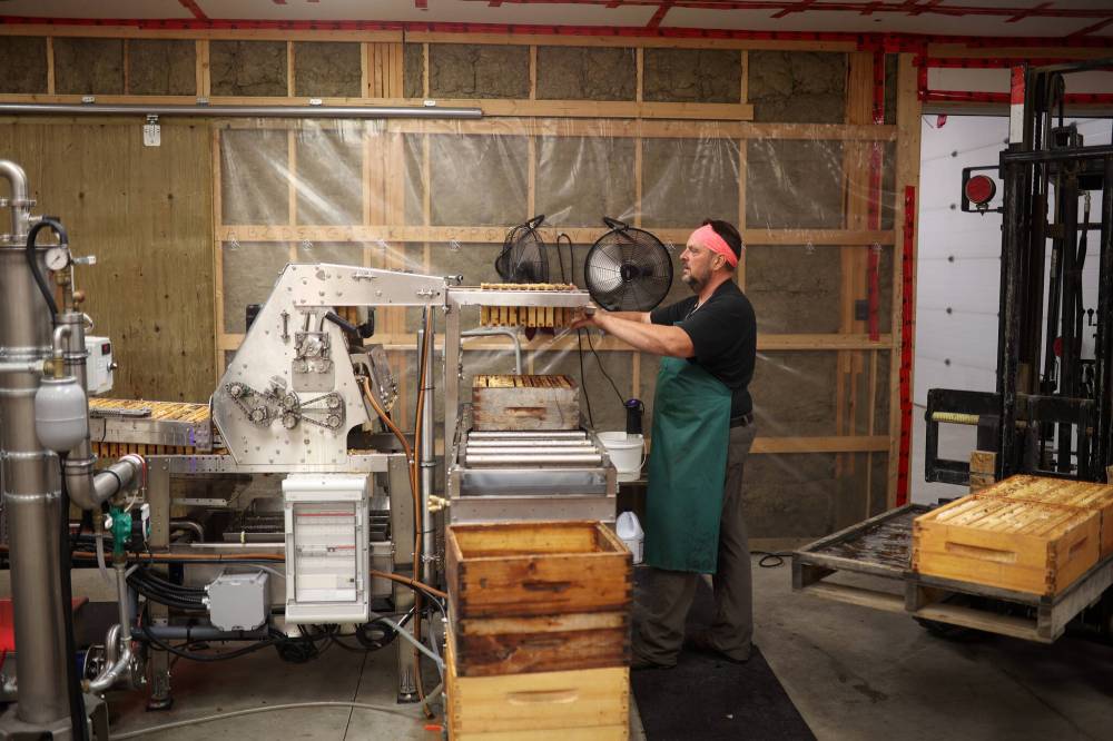 Andrew loads frames full of honeycomb onto the honey extraction line in a building at his family’s farm, southwest of Rivers on Tuesday. (Tim Smith/The Brandon Sun)