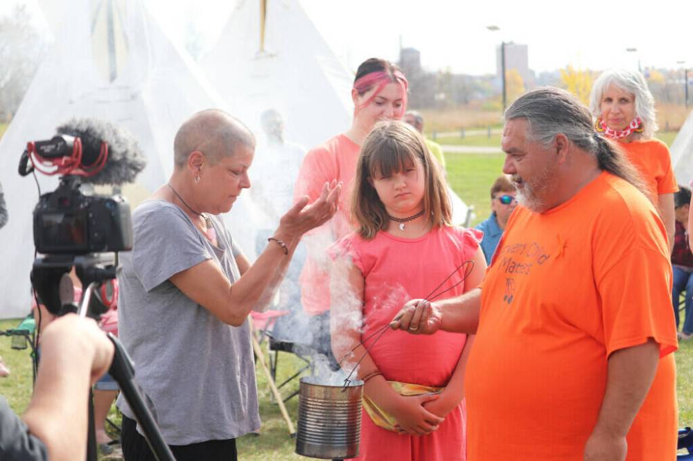 Brandon Urban Aboriginal Peoples' Council community co-ordinator Michèle LeTourneau (left) and fire keeper Todd Bone take part in a smudging ceremony at the Riverbank Discovery Centre during the final day of last year's Truth and Reconciliation Week. (File)