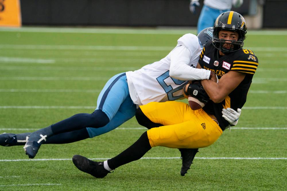 Hamilton Tiger-Cats wide receiver Kiondre Smith is tackled by Toronto Argonauts Tarvarus McFadden of the Toronto Argonauts on Sept. 5, 2022. (The Canadian Press)