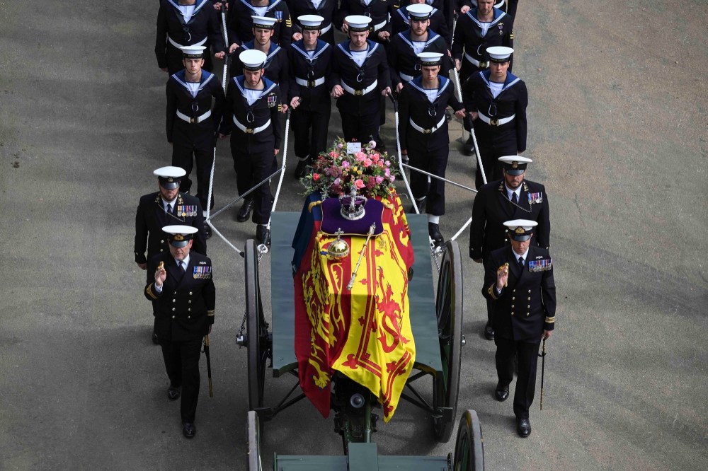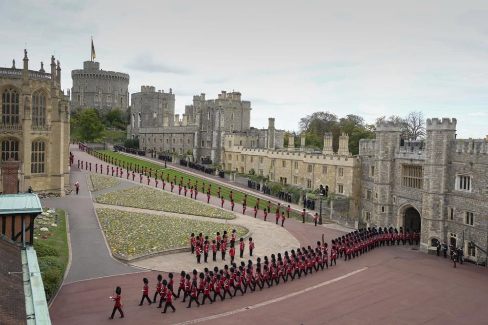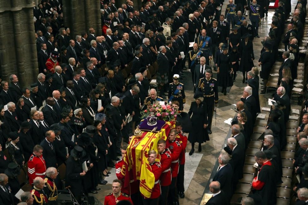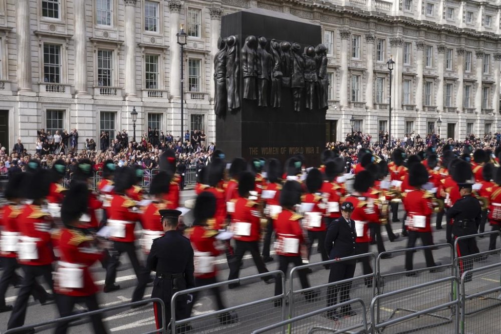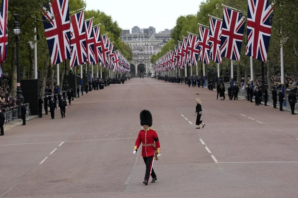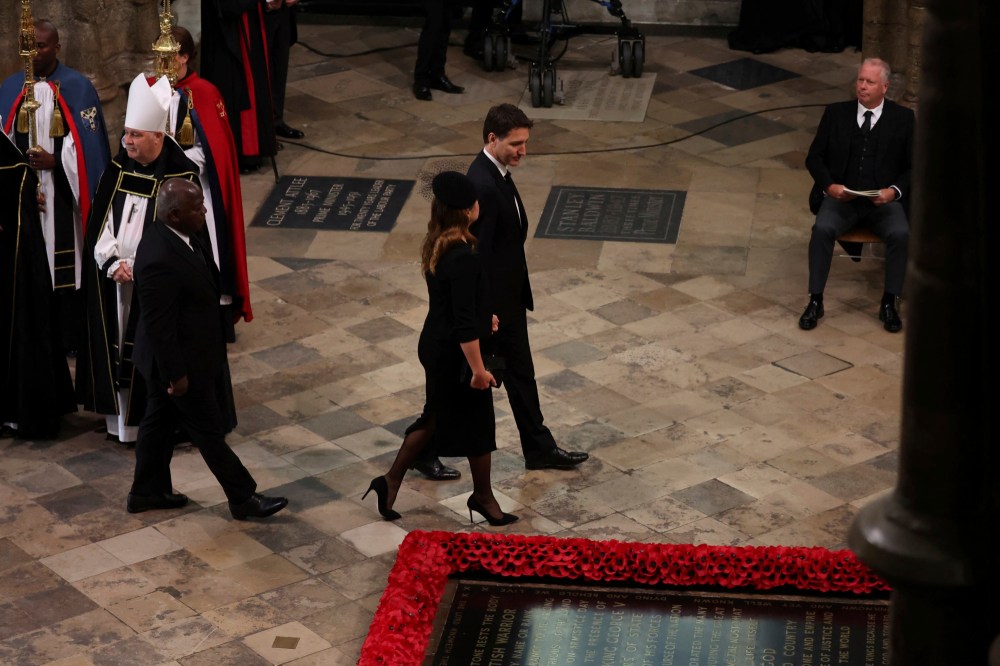 People react as they listen to the radio feed of the funeral service of Queen Elizabeth in London on Monday, September 19, 2022. Queen Elizabeth, Britain's longest-reigning monarch and a rock of stability across much of a turbulent century, died Thursday Sept. 8, 2022, after 70 years on the throne. She was 96. THE CANADIAN PRESS/Nathan DenetteMourners react as they listen to the radio feed of the funeral service of Queen Elizabeth in London on Monday, September 19, 2022. Queen Elizabeth, Britain's longest-reigning monarch and a rock of stability across much of a turbulent century, died Thursday Sept. 8, 2022, after 70 years on the throne. She was 96. THE CANADIAN PRESS/Nathan DenetteCanada's Prime Minister Justin Trudeau and his wife Sophie arrive at the Westminster Abbey for the funeral of Queen Elizabeth II, in London Monday, Sept. 19, 2022. (Phil Noble/Pool Photo via AP)The coffin procession heads down the Mall towards Wellington Arch following the State Funeral of Queen Elizabeth II held at Westminster Abbey, London, Monday, Sept. 19, 2022. (Zac Goodwin/Pool Photo via AP)Camilla, the Queen Consort, Prince George, Princess Charlotte, Kate, Princess of Wales, Meghan, Duchess of Sussex, Sophie, Countess of Wessex, Princess Beatrice, Princess Eugenie, Prince Michael and Prince Edward stand after a service at Westminster Abbey on the day of the state funeral and burial of Britain's Queen Elizabeth in London, Monday Sept. 19, 2022. (Hannah Mckay/Pool Photo via AP)The coffin of Britain's Queen Elizabeth is carried out of the Westminster Abbey on the day of her state funeral and burial, in London, Monday Sept. 19, 2022. (Hannah Mckay/Pool Photo via AP)Former British Prime Minister Theresa May with her husband Philip May, former British Prime Minister Boris Johnson with his wife Carrie Johnson and former British Prime Minister Gordon Brown with his wife Sarah Jane Brown depart, after the State Funeral of Queen Elizabeth II at Westminster Abbey, in London, Monday Sept. 19, 2022. The Queen, who died aged 96 on Sept. 8, will be buried at Windsor alongside her late husband, Prince Philip, who died last year. (Gareth Cattermole/Pool Photo via AP)The coffin of Queen Elizabeth II, draped in the Royal Standard, travels on the State Gun Carriage of the Royal Navy, from Westminster Abbey to Wellington Arch in London on Monday, Sept. 19, 2022, after the State Funeral Service of Britain's Queen Elizabeth II. (Loic Venance/Pool Photo via AP)Queen Elizabeth II's funeral cortege borne on the State Gun Carriage of the Royal Navy travels along The Mall in London, Monday, Sept. 19, 2022. (Chip Somodevilla/Pool Photo via AP)Queen Elizabeth II's funeral cortege borne on the State Gun Carriage of the Royal Navy travels along The Mall in London, Monday, Sept. 19, 2022. (Chip Somodevilla/Pool Photo via AP)The coffin of Queen Elizabeth II, draped in the Royal Standard with the Imperial State Crown and the Sovereign's orb and scepter, passes through Horse Guards Parade during her state funeral in London, Monday, Sept. 19, 2022. The Queen, who died aged 96 on Sept. 8, will be buried in the George VI Memorial Chapel at Windsor alongside her late husband, Prince Philip, who died last year. (Chris J Ratcliffe/Pool Photo via AP)The coffin of Queen Elizabeth II is carried past Wellington Arch following her funeral service in Westminster Abbey in central London Monday Sept. 19, 2022. The Queen, who died aged 96 on Sept. 8, will be buried at Windsor alongside her late husband, Prince Philip, who died last year. (Daniel Leal/Pool Photo via AP)The coffin of Queen Elizabeth II is pulled following her funeral service in Westminster Abbey in central London, Monday, Sept. 19, 2022. The Queen, who died aged 96 on Sept. 8, will be buried at Windsor alongside her late husband, Prince Philip, who died last year. (AP Photo/Vadim Ghirda, Pool)Royal Grenadier guards march onto Windsor Castle grounds in anticipation of the arrival of the coffin of Queen Elizabeth II Monday, Sept. 19, 2022. The Queen, who died aged 96 on Sept. 8, will be buried at Windsor alongside her late husband, Prince Philip, who died last year. (AP Photo/Kirsty Wigglesworth, Pool)Buckingham Palace staff stand outside its gates during Queen Elizabeth II funeral ceremonies in central London Monday, Sept. 19, 2022. The Queen, who died aged 96 on Sept. 8, will be buried at Windsor alongside her late husband, Prince Philip, who died last year. (AP Photo/Christophe Ena, Pool)The coffin of Queen Elizabeth II is pulled past Buckingham Palace following her funeral service at Westminster Abbey in central London Monday, Sept. 19, 2022. The Queen, who died aged 96 on Sept. 8, will be buried at Windsor alongside her late husband, Prince Philip, who died last year. (AP Photo/Christophe Ena, Pool)Pallbearers carry the coffin of Queen Elizabeth II, draped in the Royal Standard with the Imperial State Crown during her State Funeral at Westminster Abbey in London, Monday, Sept. 19, 2022. The Queen, who died aged 96 on Sept. 8, will be buried at Windsor alongside her late husband, Prince Philip, who died last year. THE CANADIAN PRESS/AP-James Manning/Pool Photo via APSoldiers from the Grenadier Guards march past the Cenotaph following the State funeral service for Queen Elizabeth II in Westminster Abbey in central London Monday Sept. 19, 2022. The Queen, who died aged 96 on Sept. 8, will be buried at Windsor alongside her late husband, Prince Philip, who died last year. (AP Photo/Scott Garfitt, Pool)King Charles III, Camilla, Queen Consort and other members of the Royal family follow the coffin of Queen Elizabeth II as it is carried into Westminster Abbey ahead of her State Funeral, in London, Monday Sept. 19, 2022. The Queen, who died aged 96 on Sept. 8, will be buried at Windsor alongside her late husband, Prince Philip, who died last year. (Jack Hill/Pool Photo via AP)Members of the armed forces march during the funeral procession for Queen Elizabeth II in London, Monday, Sept. 19, 