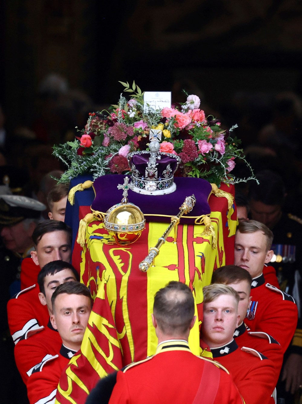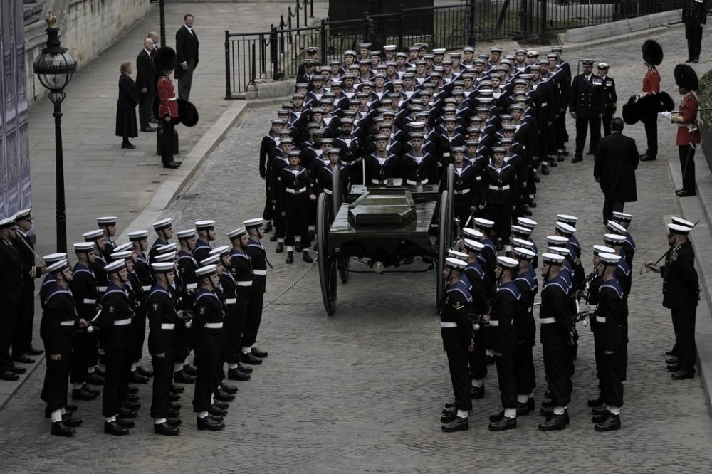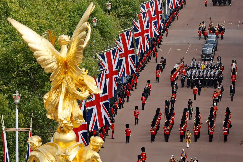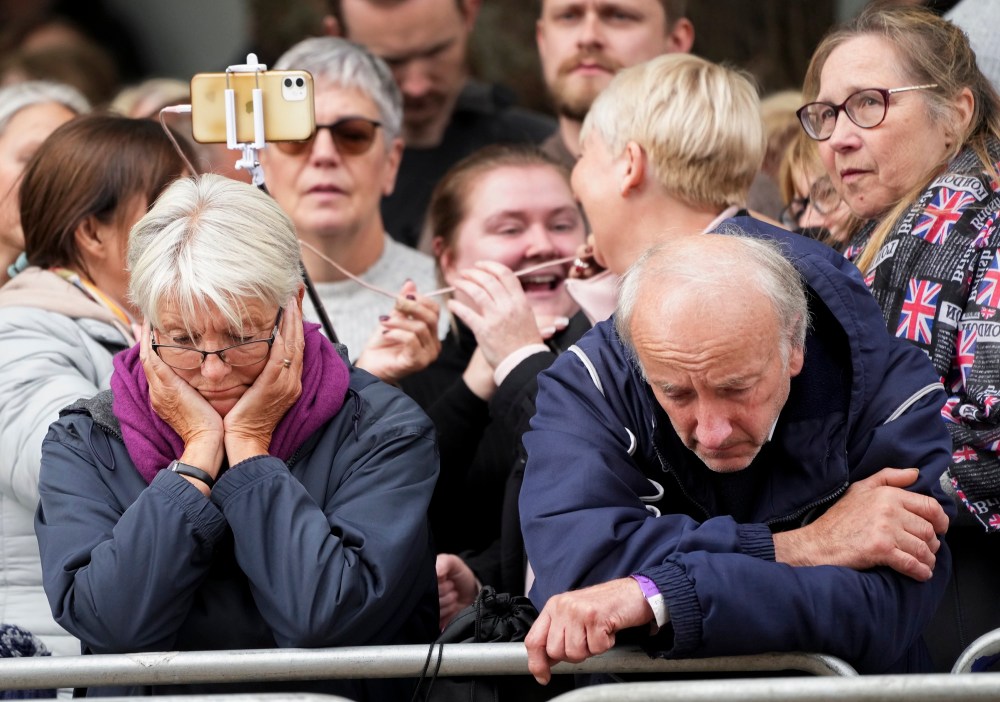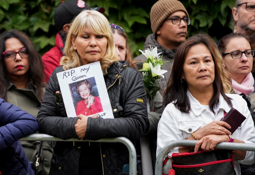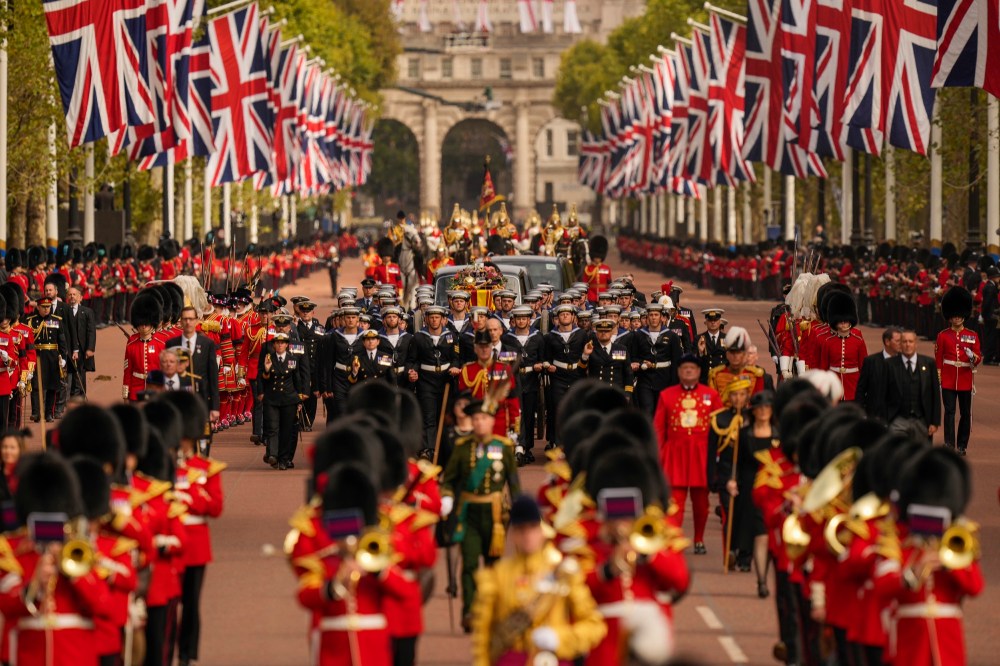 People react as they listen to the radio feed of the funeral service of Queen Elizabeth in London on Monday, September 19, 2022. Queen Elizabeth, Britain's longest-reigning monarch and a rock of stability across much of a turbulent century, died Thursday Sept. 8, 2022, after 70 years on the throne. She was 96. THE CANADIAN PRESS/Nathan DenetteMourners react as they listen to the radio feed of the funeral service of Queen Elizabeth in London on Monday, September 19, 2022. Queen Elizabeth, Britain's longest-reigning monarch and a rock of stability across much of a turbulent century, died Thursday Sept. 8, 2022, after 70 years on the throne. She was 96. THE CANADIAN PRESS/Nathan DenetteCanada's Prime Minister Justin Trudeau and his wife Sophie arrive at the Westminster Abbey for the funeral of Queen Elizabeth II, in London Monday, Sept. 19, 2022. (Phil Noble/Pool Photo via AP)The coffin procession heads down the Mall towards Wellington Arch following the State Funeral of Queen Elizabeth II held at Westminster Abbey, London, Monday, Sept. 19, 2022. (Zac Goodwin/Pool Photo via AP)Camilla, the Queen Consort, Prince George, Princess Charlotte, Kate, Princess of Wales, Meghan, Duchess of Sussex, Sophie, Countess of Wessex, Princess Beatrice, Princess Eugenie, Prince Michael and Prince Edward stand after a service at Westminster Abbey on the day of the state funeral and burial of Britain's Queen Elizabeth in London, Monday Sept. 19, 2022. (Hannah Mckay/Pool Photo via AP)The coffin of Britain's Queen Elizabeth is carried out of the Westminster Abbey on the day of her state funeral and burial, in London, Monday Sept. 19, 2022. (Hannah Mckay/Pool Photo via AP)Former British Prime Minister Theresa May with her husband Philip May, former British Prime Minister Boris Johnson with his wife Carrie Johnson and former British Prime Minister Gordon Brown with his wife Sarah Jane Brown depart, after the State Funeral of Queen Elizabeth II at Westminster Abbey, in London, Monday Sept. 19, 2022. The Queen, who died aged 96 on Sept. 8, will be buried at Windsor alongside her late husband, Prince Philip, who died last year. (Gareth Cattermole/Pool Photo via AP)The coffin of Queen Elizabeth II, draped in the Royal Standard, travels on the State Gun Carriage of the Royal Navy, from Westminster Abbey to Wellington Arch in London on Monday, Sept. 19, 2022, after the State Funeral Service of Britain's Queen Elizabeth II. (Loic Venance/Pool Photo via AP)Queen Elizabeth II's funeral cortege borne on the State Gun Carriage of the Royal Navy travels along The Mall in London, Monday, Sept. 19, 2022. (Chip Somodevilla/Pool Photo via AP)Queen Elizabeth II's funeral cortege borne on the State Gun Carriage of the Royal Navy travels along The Mall in London, Monday, Sept. 19, 2022. (Chip Somodevilla/Pool Photo via AP)The coffin of Queen Elizabeth II, draped in the Royal Standard with the Imperial State Crown and the Sovereign's orb and scepter, passes through Horse Guards Parade during her state funeral in London, Monday, Sept. 19, 2022. The Queen, who died aged 96 on Sept. 8, will be buried in the George VI Memorial Chapel at Windsor alongside her late husband, Prince Philip, who died last year. (Chris J Ratcliffe/Pool Photo via AP)The coffin of Queen Elizabeth II is carried past Wellington Arch following her funeral service in Westminster Abbey in central London Monday Sept. 19, 2022. The Queen, who died aged 96 on Sept. 8, will be buried at Windsor alongside her late husband, Prince Philip, who died last year. (Daniel Leal/Pool Photo via AP)The coffin of Queen Elizabeth II is pulled following her funeral service in Westminster Abbey in central London, Monday, Sept. 19, 2022. The Queen, who died aged 96 on Sept. 8, will be buried at Windsor alongside her late husband, Prince Philip, who died last year. (AP Photo/Vadim Ghirda, Pool)Royal Grenadier guards march onto Windsor Castle grounds in anticipation of the arrival of the coffin of Queen Elizabeth II Monday, Sept. 19, 2022. The Queen, who died aged 96 on Sept. 8, will be buried at Windsor alongside her late husband, Prince Philip, who died last year. (AP Photo/Kirsty Wigglesworth, Pool)Buckingham Palace staff stand outside its gates during Queen Elizabeth II funeral ceremonies in central London Monday, Sept. 19, 2022. The Queen, who died aged 96 on Sept. 8, will be buried at Windsor alongside her late husband, Prince Philip, who died last year. (AP Photo/Christophe Ena, Pool)The coffin of Queen Elizabeth II is pulled past Buckingham Palace following her funeral service at Westminster Abbey in central London Monday, Sept. 19, 2022. The Queen, who died aged 96 on Sept. 8, will be buried at Windsor alongside her late husband, Prince Philip, who died last year. (AP Photo/Christophe Ena, Pool)Pallbearers carry the coffin of Queen Elizabeth II, draped in the Royal Standard with the Imperial State Crown during her State Funeral at Westminster Abbey in London, Monday, Sept. 19, 2022. The Queen, who died aged 96 on Sept. 8, will be buried at Windsor alongside her late husband, Prince Philip, who died last year. THE CANADIAN PRESS/AP-James Manning/Pool Photo via APSoldiers from the Grenadier Guards march past the Cenotaph following the State funeral service for Queen Elizabeth II in Westminster Abbey in central London Monday Sept. 19, 2022. The Queen, who died aged 96 on Sept. 8, will be buried at Windsor alongside her late husband, Prince Philip, who died last year. (AP Photo/Scott Garfitt, Pool)King Charles III, Camilla, Queen Consort and other members of the Royal family follow the coffin of Queen Elizabeth II as it is carried into Westminster Abbey ahead of her State Funeral, in London, Monday Sept. 19, 2022. The Queen, who died aged 96 on Sept. 8, will be buried at Windsor alongside her late husband, Prince Philip, who died last year. (Jack Hill/Pool Photo via AP)Members of the armed forces march during the funeral procession for Queen Elizabeth II in London, Monday, Sept. 19, 