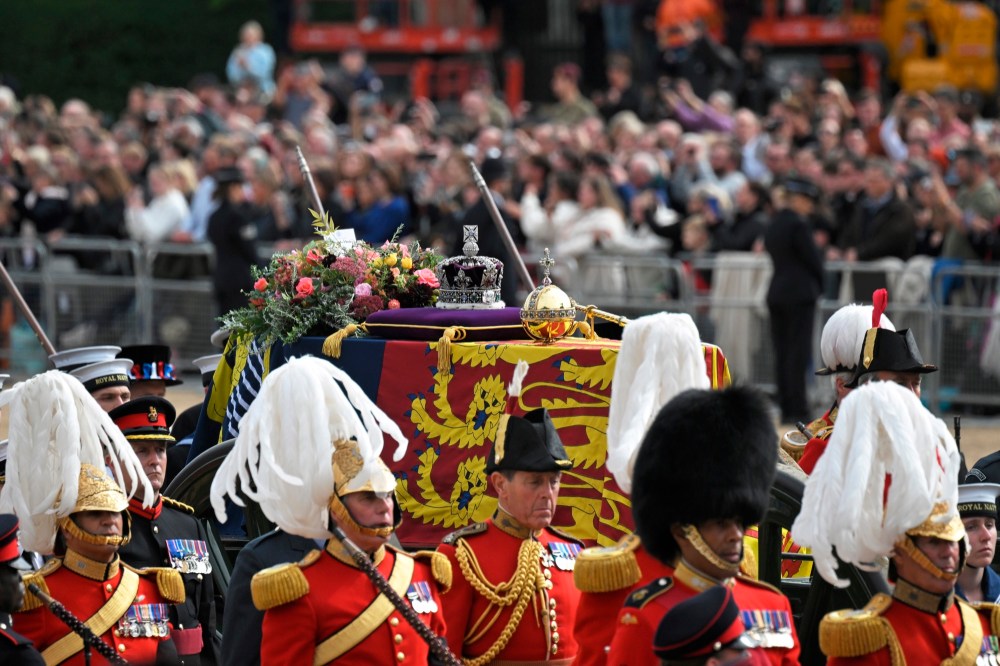The State Gun Carriage carries the coffin of Queen Elizabeth II, draped in the Royal Standard with the Imperial State Crown during her State Funeral, in London, Monday, Sept. 19, 2022. The Queen, who died aged 96 on Sept. 8, will be buried at Windsor alongside her late husband, Prince Philip, who died last year. (Stefan Rousseau/Pool Photo via AP)