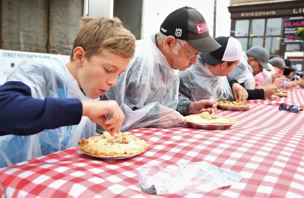 Boissevain Street Fest had plenty of fun and games, including an old-fashioned pie-eating contest on Saturday. Among the youngest was Caleb Duerksen, 11, who dove into his apple pie in a race to earn a trophy and bragging rights. (Karen McKinley/The Brandon Sun)