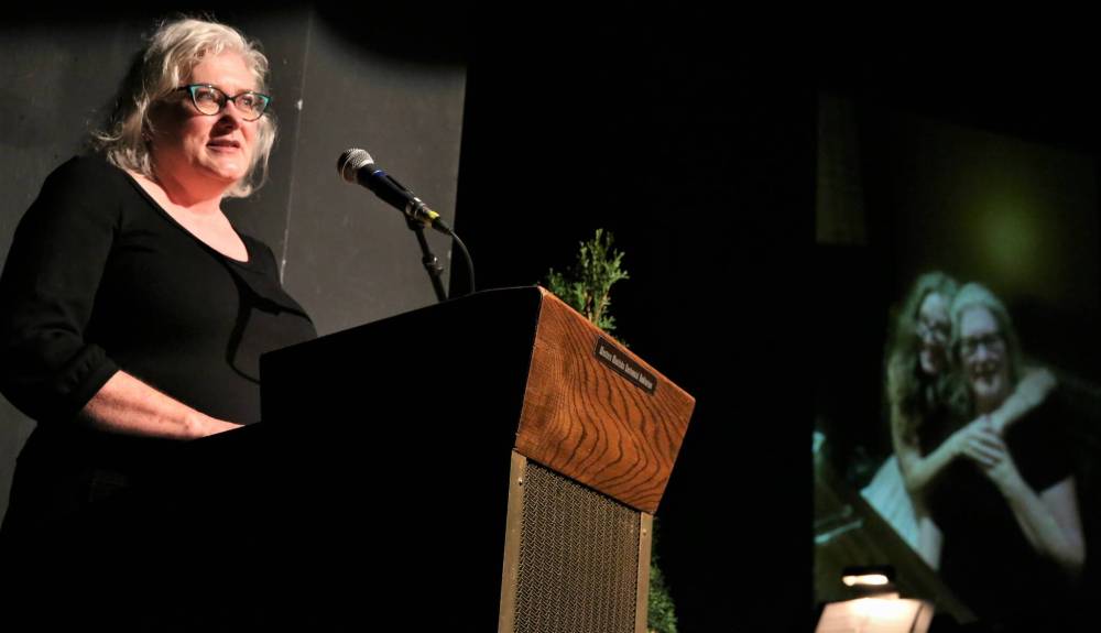 Fellow actor James Forsythe took to the stage to give a monologue as part of his speech to honour Nelson, playfully complaining about her dying before him as his way of getting in the last word. (Karen McKinley/The Brandon Sun)