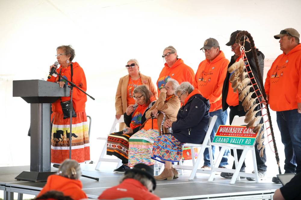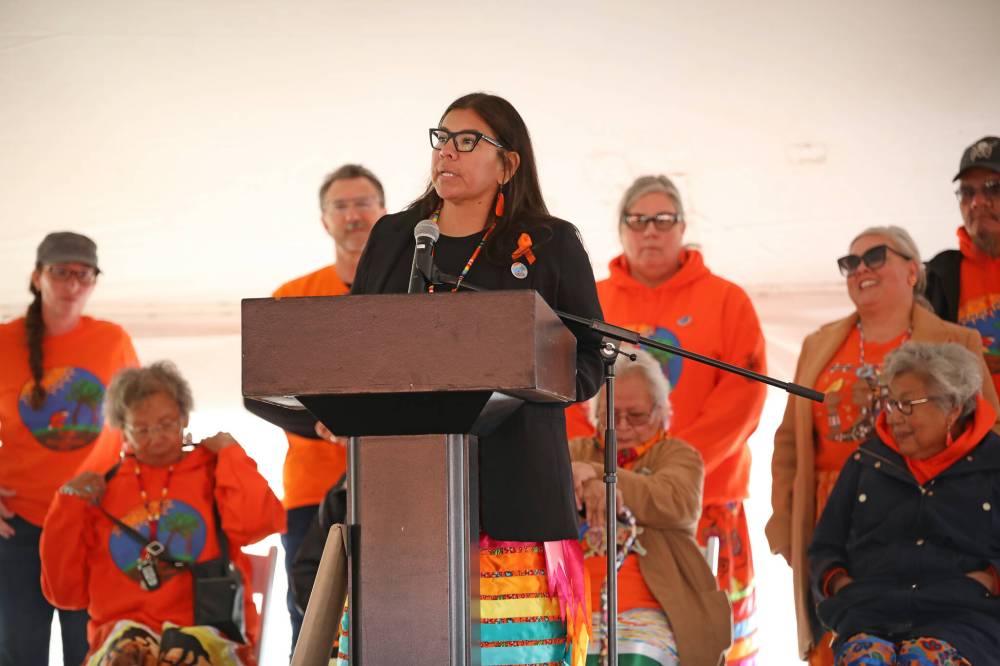 Sioux Valley Dakota Nation Chief Jennifer Bone speaks prior to the Orange Shirt Day Walk during Truth and Reconciliation Week at the Riverbank Discovery Centre Friday. (Tim Smith/The Brandon Sun)
