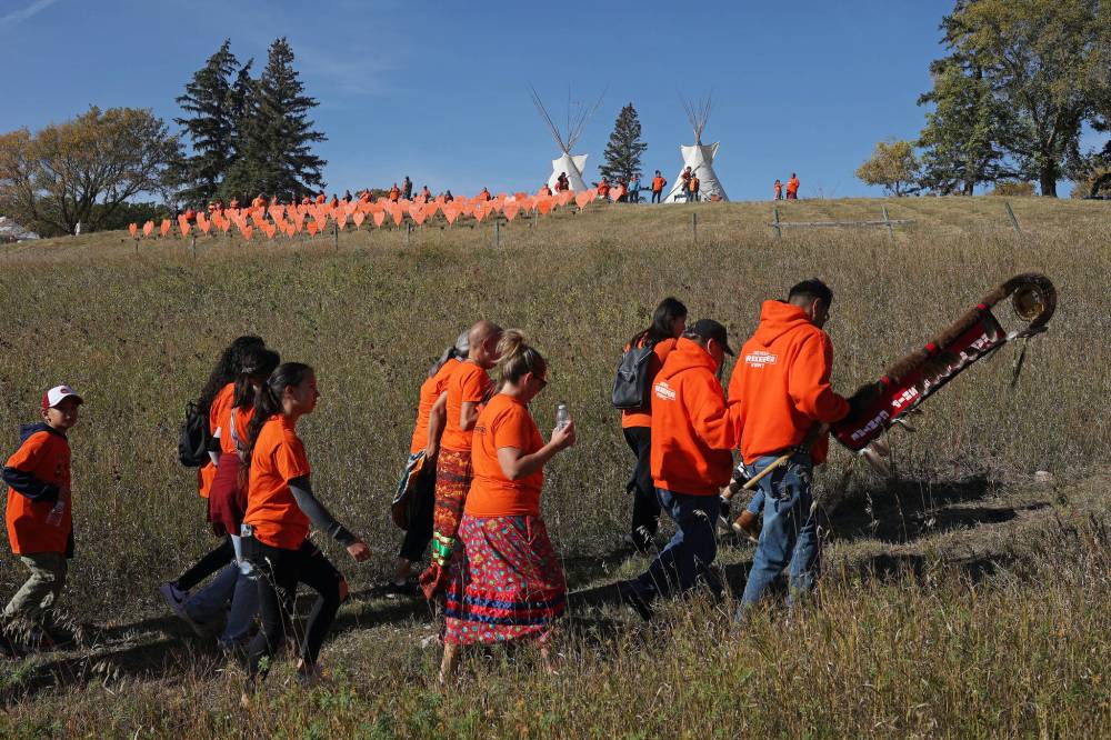 Participants march through the site of the former Brandon Indian Residential School during the Orange Shirt Day Walk as part of Truth and Reconciliation Week Friday. (Tim Smith/The Brandon Sun)