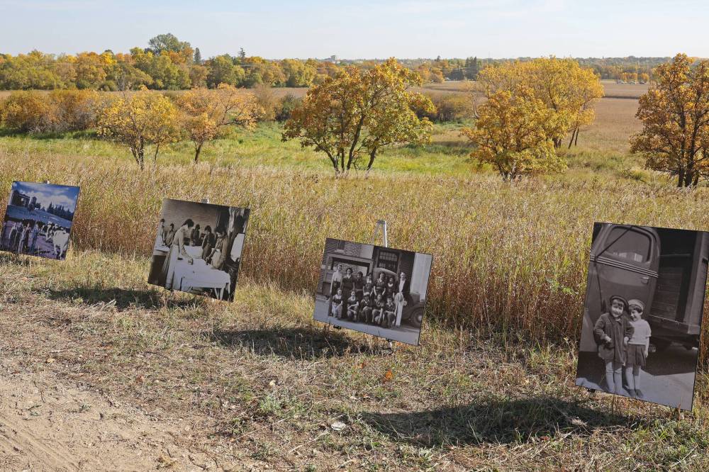 Historical photos of the former Brandon Indian Residential School line the Orange Shirt Day walk route at the school site. (Tim Smith/The Brandon Sun)