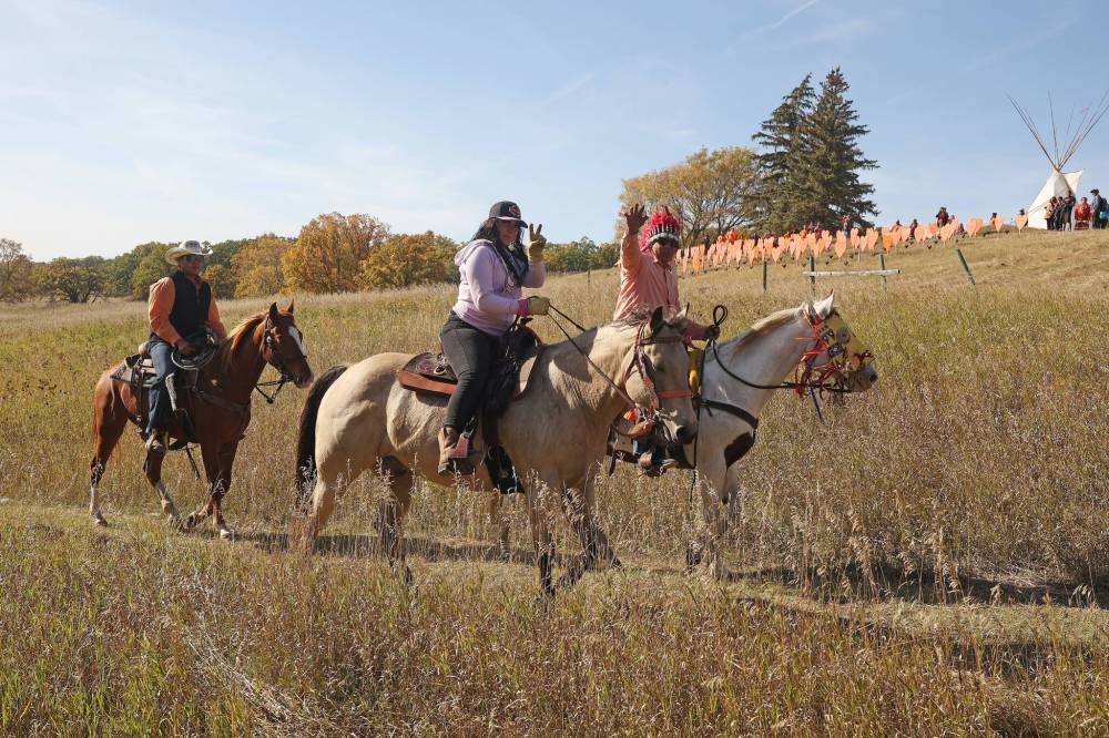 Sioux Valley Unity Riders arrive at the site of the former Brandon Indian Residential School at the end of their six-day Every Child Matters Ride on Friday as part of Truth and Reconciliation Week. (Tim Smith/The Brandon Sun)