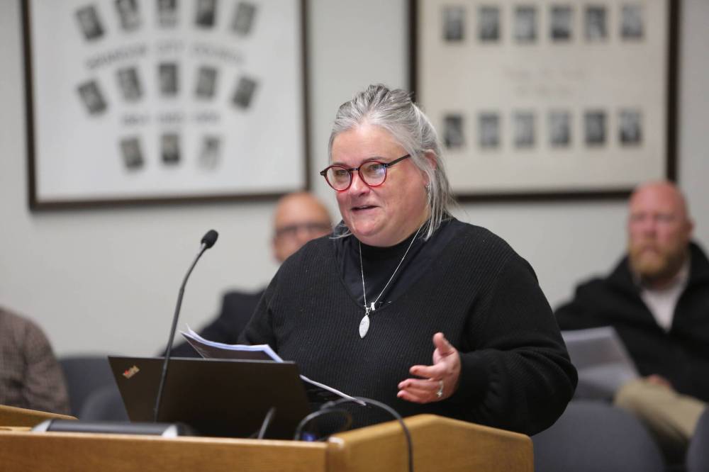 Art Gallery of Southwestern Manitoba board chair Alysha Farrell speaks in favour of the city applying for a $5 million grant to cover half the cost of renovating the Library/Arts Building at Monday's Brandon City Council meeting. (Colin Slark/The Brandon Sun)
