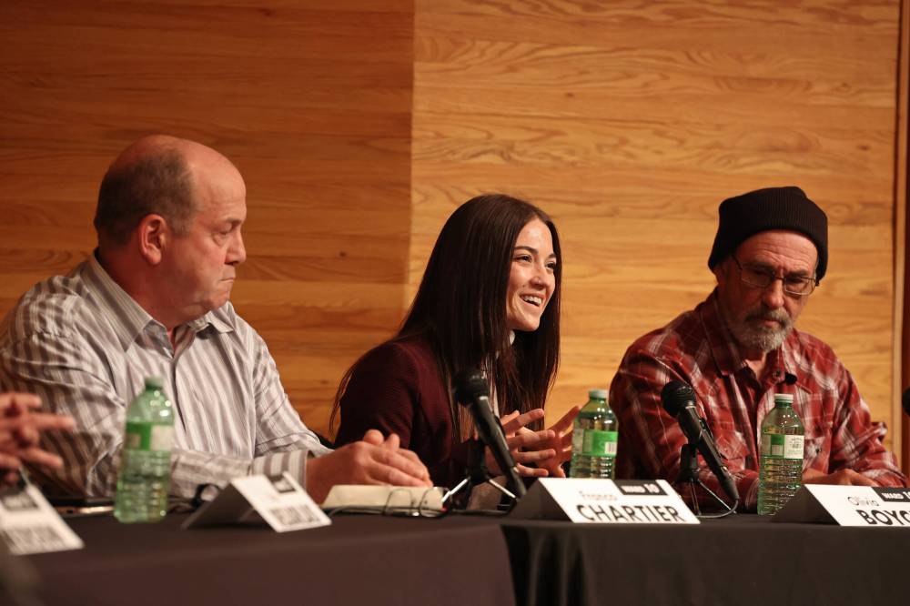 Brandon City Council candidate Olivia Boyce (centre) — flanked by Franco Chartier (left) and Dale Bates — responds during a candidates debate Wednesday evening. (File)