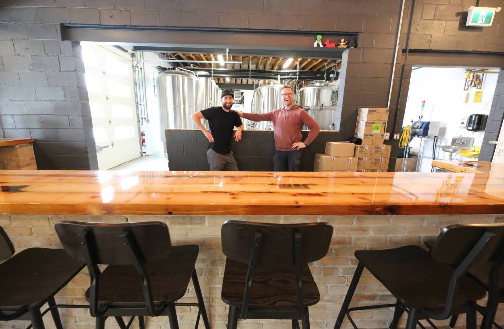 Business partners Ben Loewen (left) and Sid Stevenson pose Wednesday afternoon behind the crafted wooden bar that offers a clear view into the Section 6 brewhouse. (Matt Goerzen/The Brandon Sun)