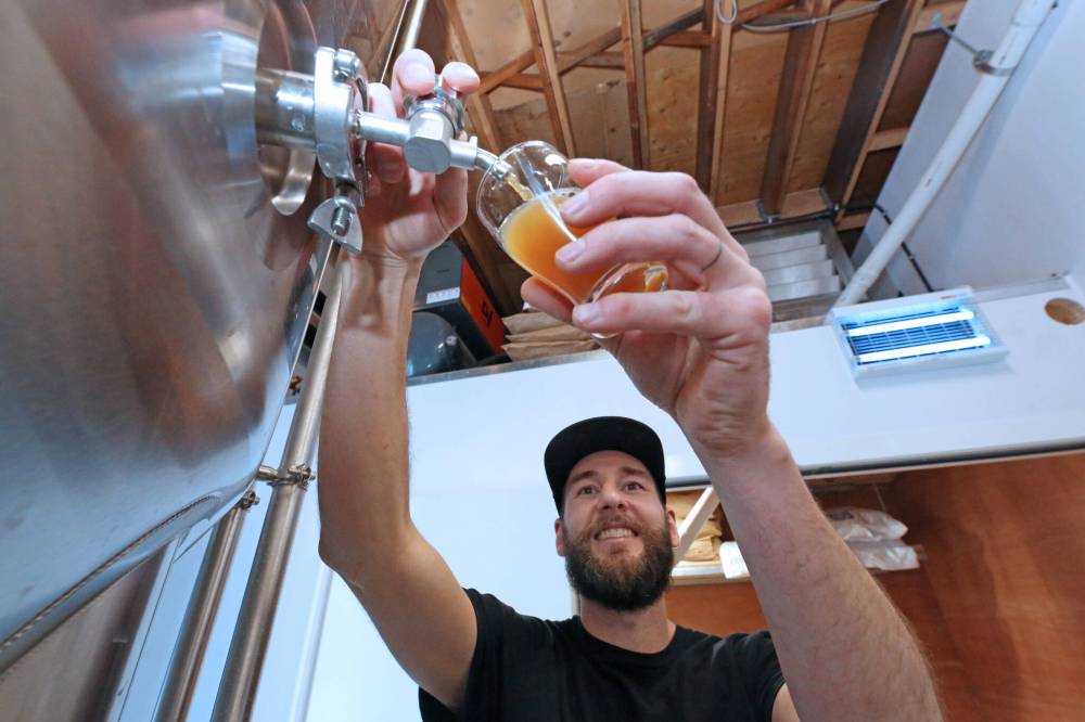 Ben Loewen pours a sample of his new PUB English ale, which is still in the process of fermenting. Loewen and Sid Stevenson hope to have four new beers ready for public consumption by opening day on Dec. 3. (Matt Goerzen/The Brandon Sun)