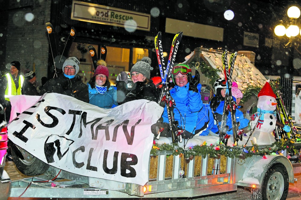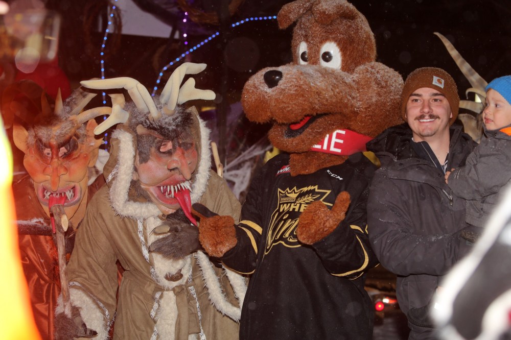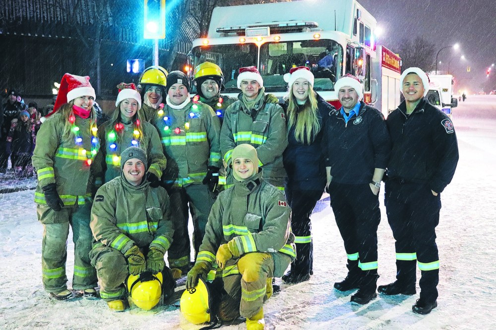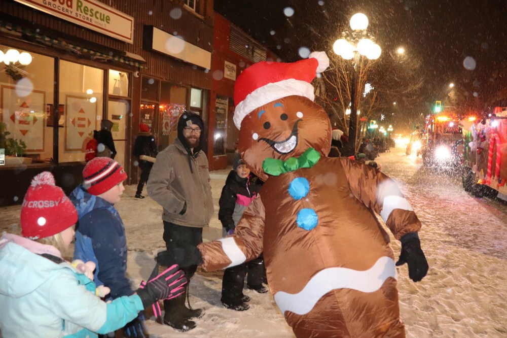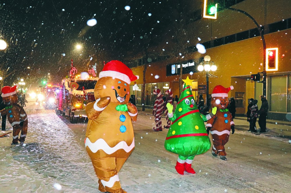 Local residents line up on both sides of Rosser Avenue Saturday night to watch the 2022 Brandon Santa Parade, which featured all manner of holiday-themed floats and mascots handing out candy and high fives. This year's parade, the first since 2019, featured around 45 floats and countless other accompanying vehicles according to event organizers. (Kyle Darbyson/The Brandon Sun)