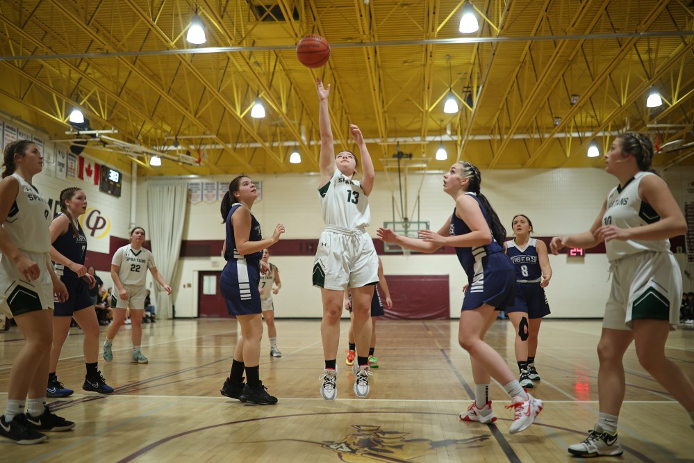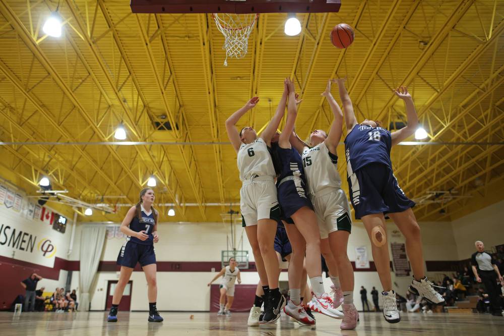 Neelin Spartans and Swan River Tigers players jostle for a rebound during their Crocus Plains Early Bird varsity girls basketball tournament game on Friday. (Tim Smith/The Brandon Sun)