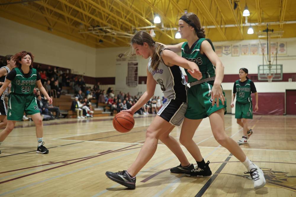 Jessie Sumner of the Vincent Massey Vikings tries to dribble around Jaxen Furkalo of the Dauphin Clippers.
