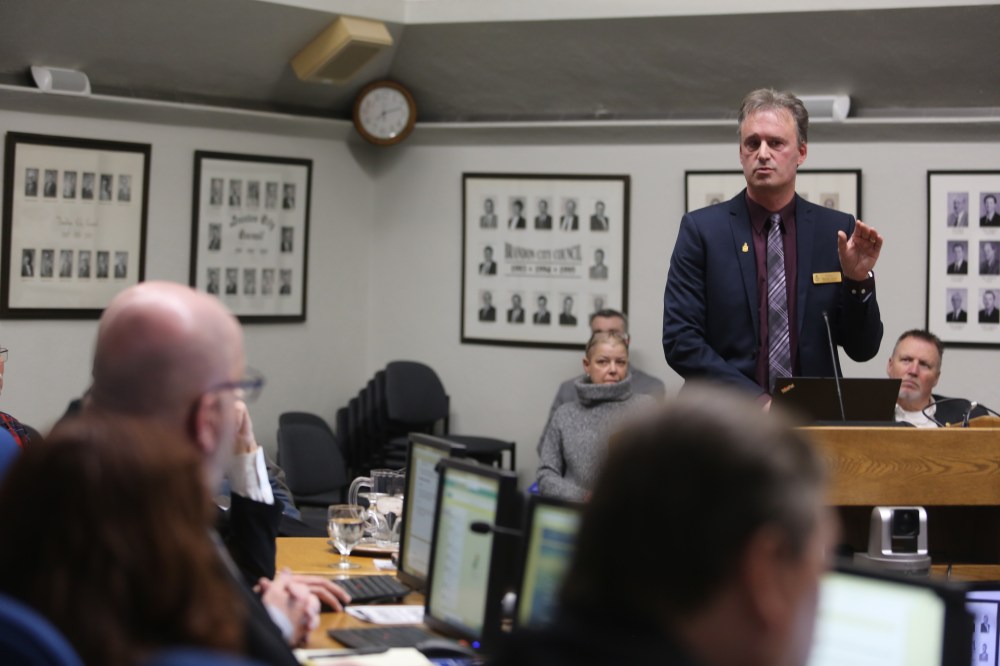 Commonwealth Air Training Plan Museum executive director Stephen Hayter answers questions from city council during Monday's regular council meeting. The museum has been closed since early November after damage to the building was found that put its roof at risk of collapse. At Monday's meeting, Hayter made a pitch for funds to help the museum make emergency repairs. (Ian Hitchen/The Brandon Sun)