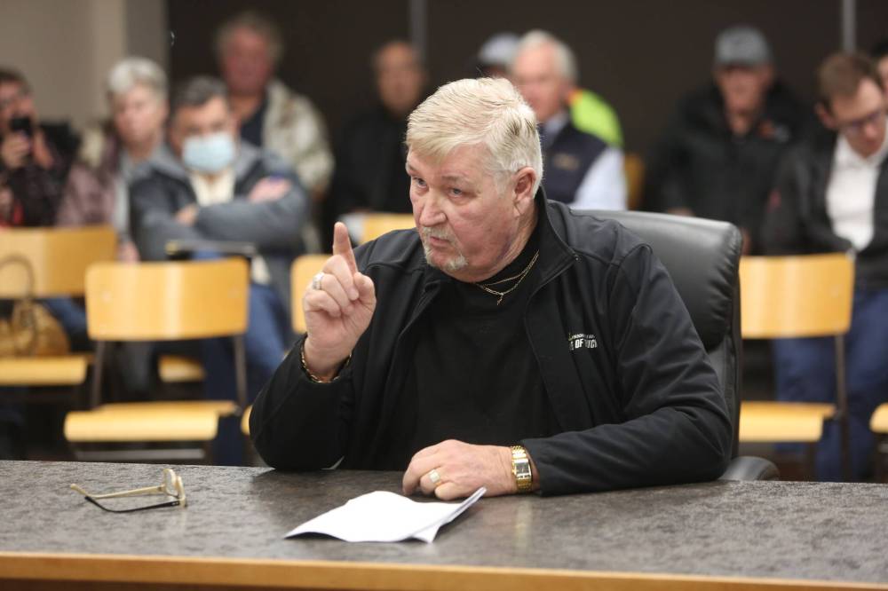 Fred Gilbert, owner of Fred Gilbert Trucking and gravel pits in the RM of Cornwallis, makes his point during a council meeting Tuesday evening. Gilbert was there to speak against a move by the municipality to increase aggregate mining and transport fees. (Ian Hitchen/The Brandon Sun)