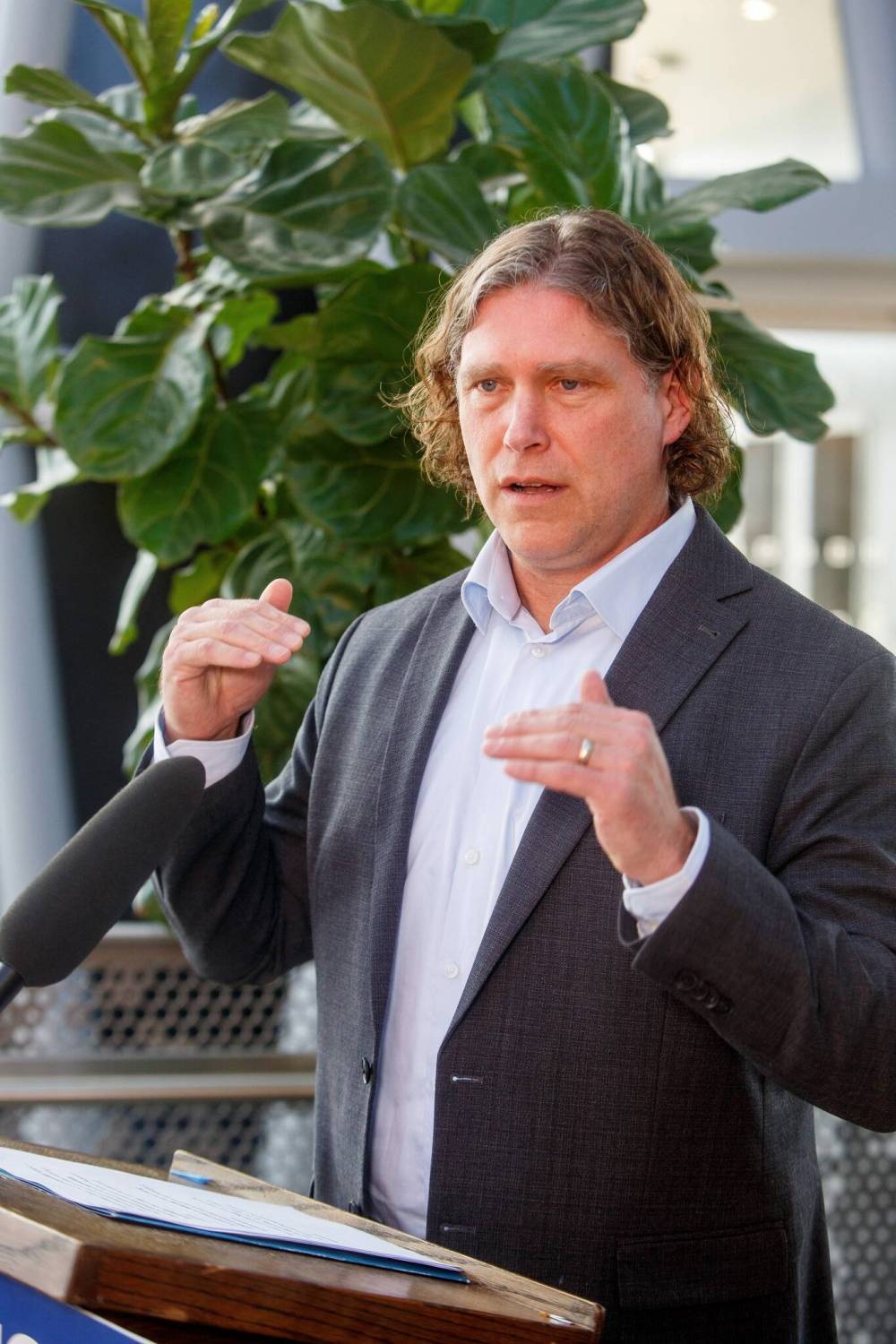Brandon Mayor Jeff Fawcett speaks during Premier Heather Stefanson's announcement at a media event in Winnipeg Friday morning that the Manitoba government will be increasing the municipalities operating grant that will see an extra $2.3 million flow into City of Brandon coffers this budget year. (Winnipeg Free Press)