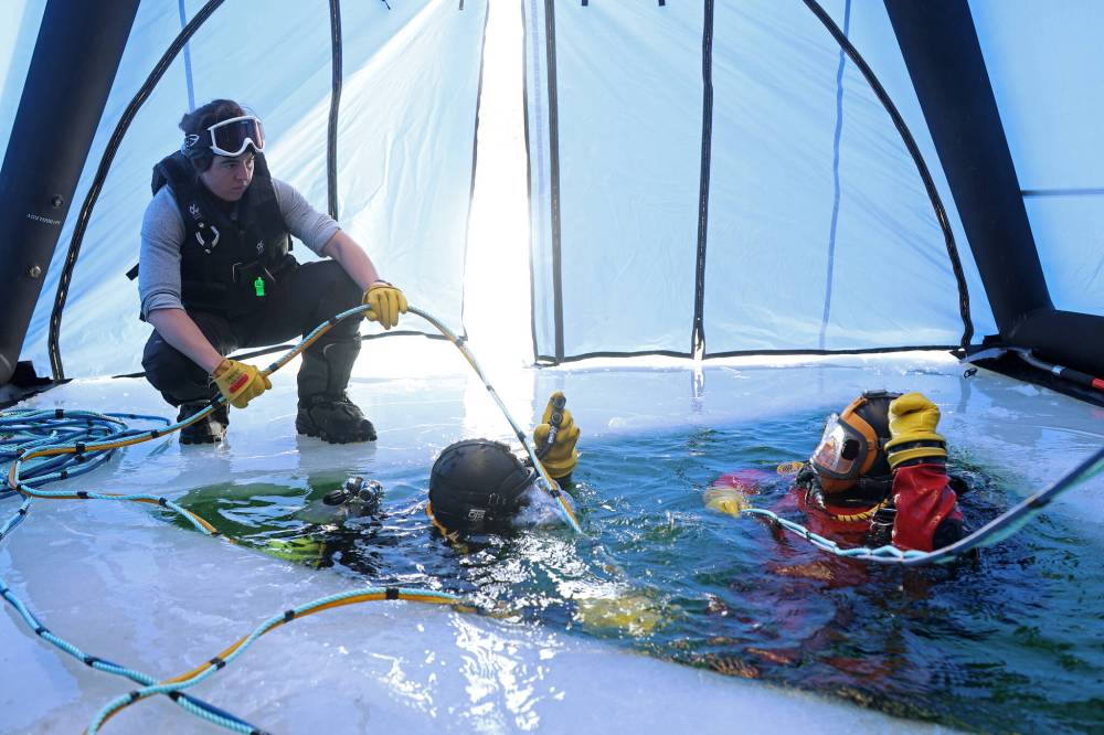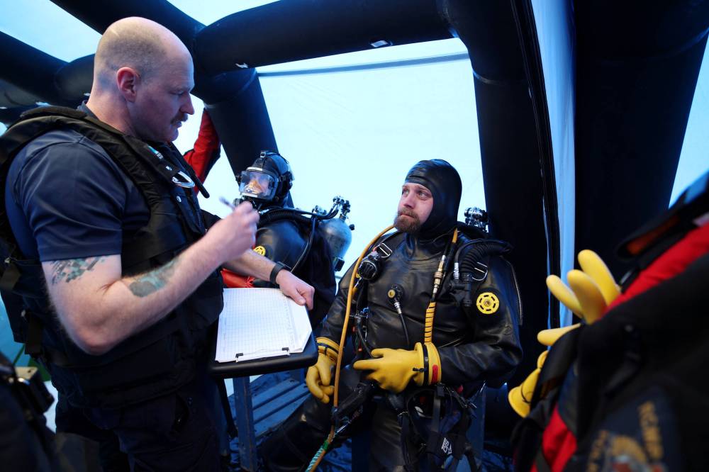 On Tuesday, sets of two divers took turns doing emergency drills, which included searches when a team diver gets lost underwater.