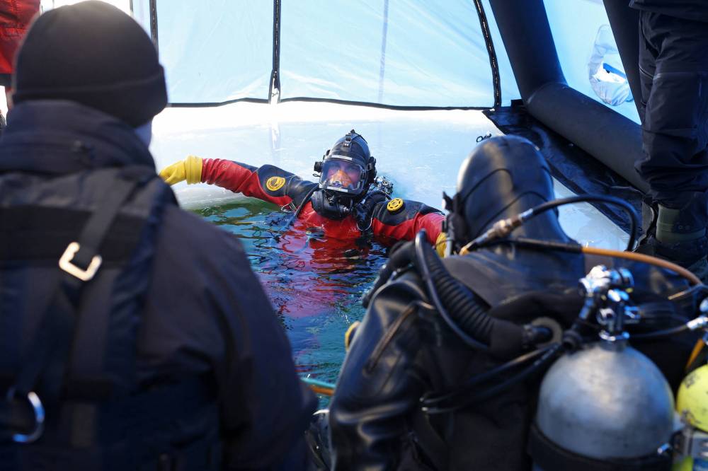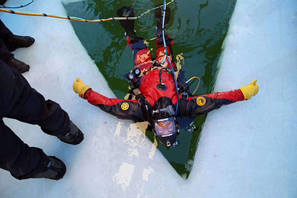 On Monday, the team members arrived at Riding Mountain National Park and prepared the site on the lake near the Clear Lake Golf Course for their training, including cutting a hole in the ice for divers to enter the water.