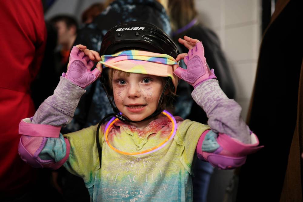 Brielle Reykdal, 5, is dressed in a stylish and colourful outfit while waiting in line for the opening of Roller Disco at the Sportsplex Arena on Thursday evening. (Tim Smith/The Brandon Sun)