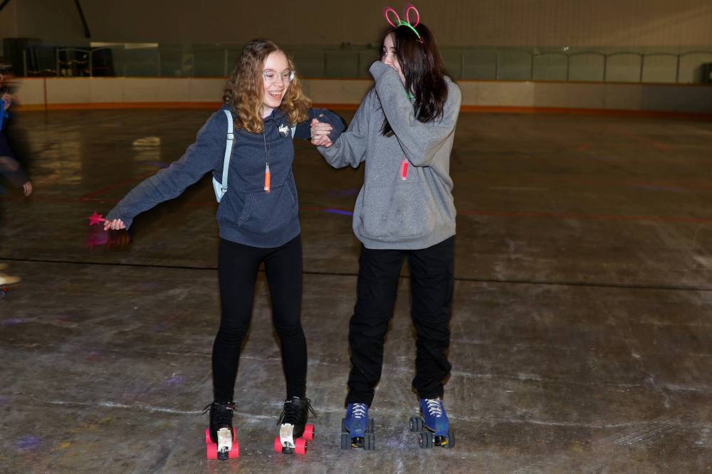 Athena Ringland and Leah Thurston roller-skate during Roller Disco at the Sportsplex Arena on Thursday evening. (Tim Smith/The Brandon Sun)