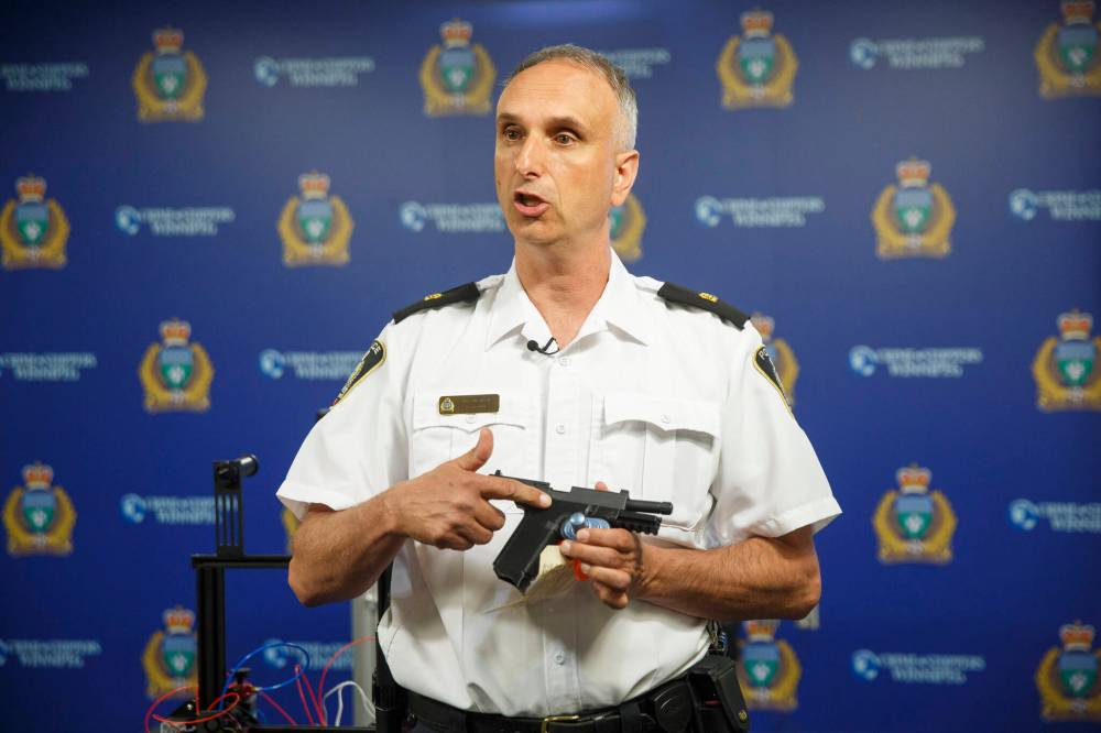 Winnipeg Police Insp. Max Waddell demonstrates how similar 3D-printed firearms are to manufactured versions. The so-called "ghost guns" are weapons made by individuals without serial numbers or other identifying markings, often with the use of a 3D printer. (Winnipeg Free Press)