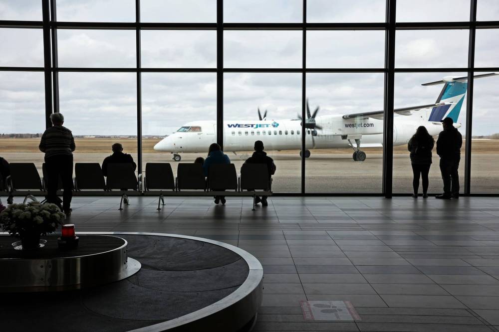 People watch from the arrivals area as a WestJet plane taxis after landing at the Brandon Municipal Airport. A potential strike by WestJet pilots starting this week isn't expected to impact air travel in Brandon. (File)