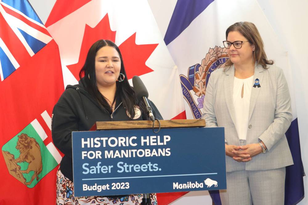 Brandon Bear Clan outreach worker Jade Gamblin thanks the Manitoba government for new funding, which the organization will use to purchase a minibus, at a news conference at Brandon police headquarters Thursday as Premier Heather Stefanson looks on. (Kyle Darbyson/The Brandon Sun)