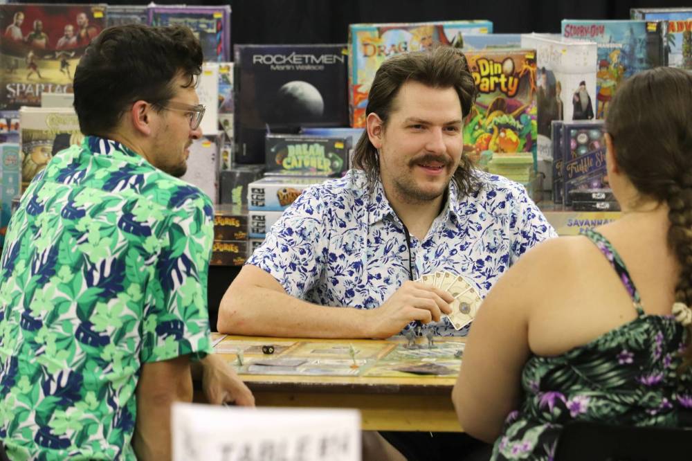 PrairieCon attendees come together to play a game of Desperado at the Brandon Curling Club on Friday afternoon. (Kyle Darbyson/The Brandon Sun)