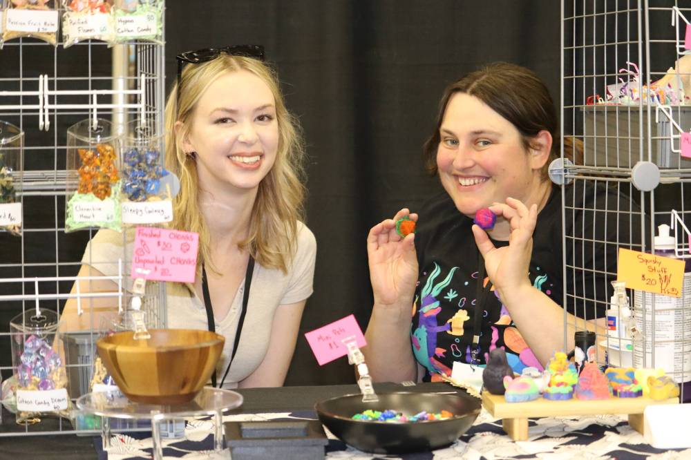 Vendors Paige Bender and Samantha Howell of Karasu Nest showcase their resin dice and other gaming accessories during the opening day of PrairieCon 42. (Kyle Darbyson/The Brandon Sun)