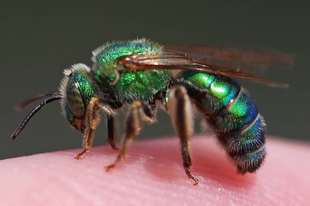A bright metallic green and blue sweat bee perches on the finger of photographer Tim Smith at Camp Hughes west of Carberry earlier this week. (Tim Smith/The Brandon Sun)