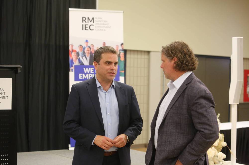 Patrick Mackenzie, CEO of Immigrant Employment Council of B.C. (IECBC), talks with Brandon Mayor Jeff Fawcett during the inaugural Workforce Development Summit hosted by the Rural Manitoba Immigrant Employment Council (RMIEC), which is an initiative of Westman Immigrant Services, at the Keystone Centre on Monday. (Michele McDougall/The Brandon Sun)