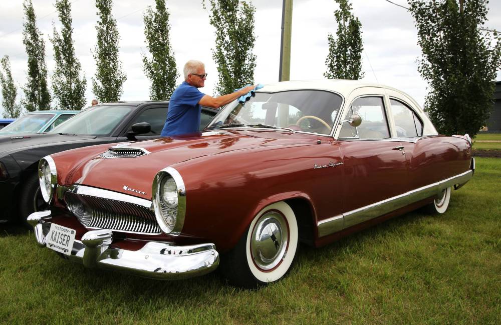 A 1954 Kaiser Special owned by Butch and Val Buchanan of Fargo, N.D., near Brandon on Wednesday. There were less than 8,000 of these vehicles built by automobile executive Joseph W. Frazer and industrialist Henry J. Kaiser, who started their company to compete with General Motors, Ford, and Chrysler, but halted production in 1955. (Michele McDougall/The Brandon Sun)