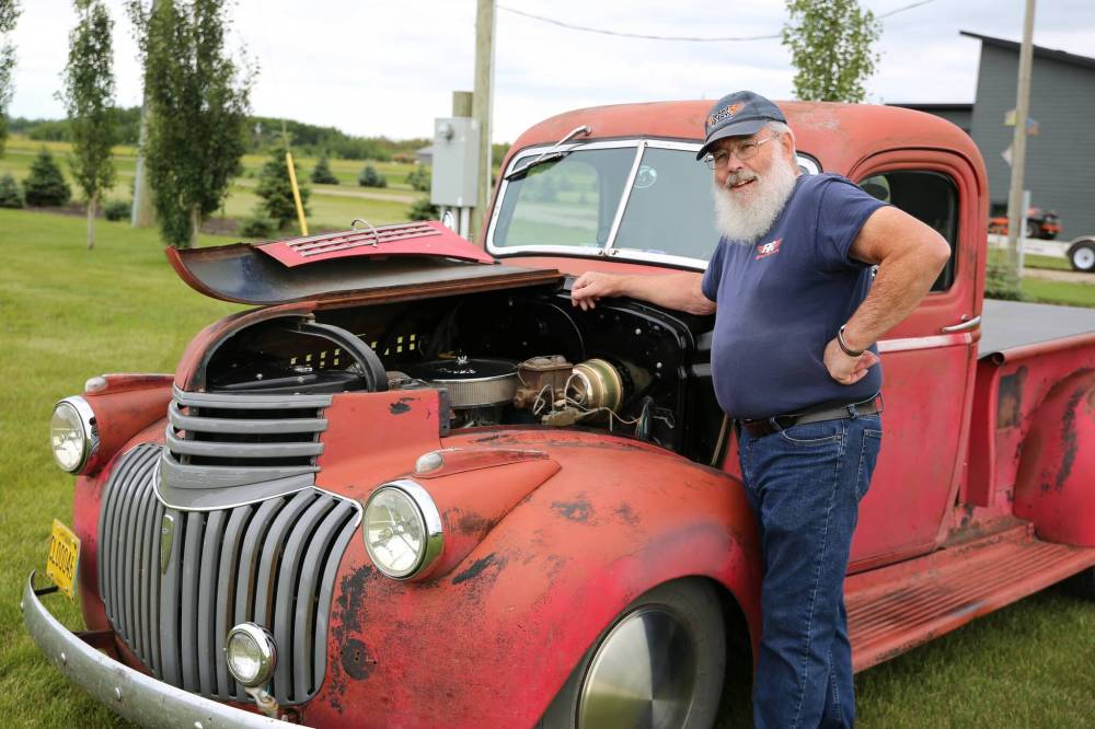 Brandon's Jim Stewart with his 1946 Chevrolet half-ton with the original body, but rebuilt engine and interior near Brandon on Wednesday. Stewart will be one of hundreds of car enthusiasts at this weekend's Western Canada Power Cruise in Medicine Hat, Alta.
