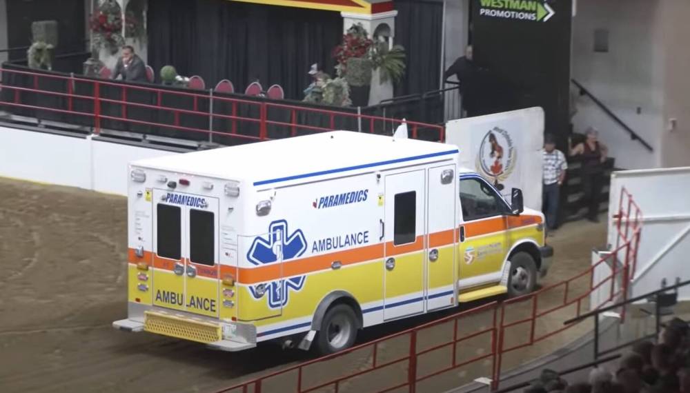An ambulance leaves Westoba Place with a patient who fell from her horse during the barrel racing competition on July 22 in Brandon. (Video still, 2023 World Clydesdale Show, Youtube)