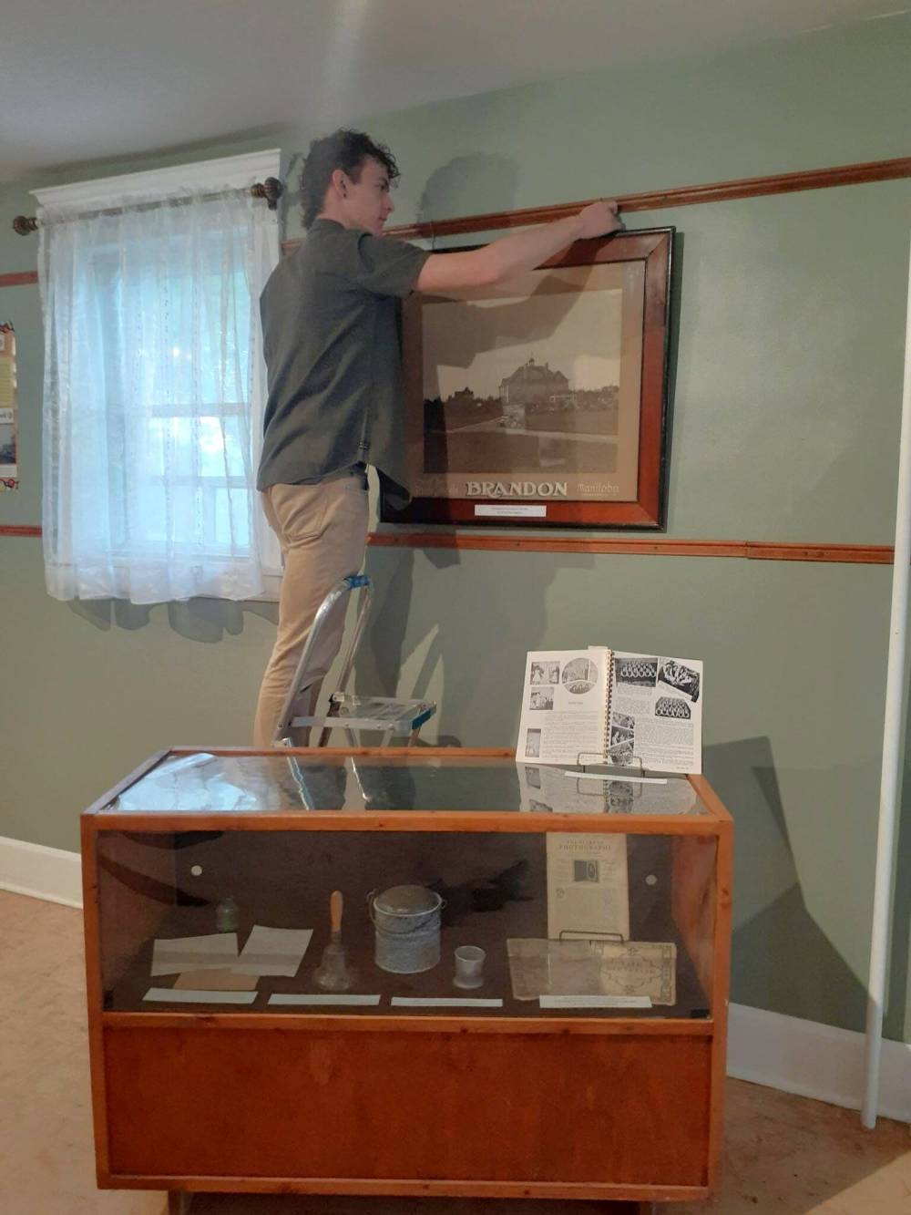 Hall sets up some displays for the Daly House Museum's latest exhibit, "School Days: History of Schools and School-life in Brandon," in late August. Hall put this exhibit together with some help from Delaurier, who's a fellow Brandon University student. (Submitted)