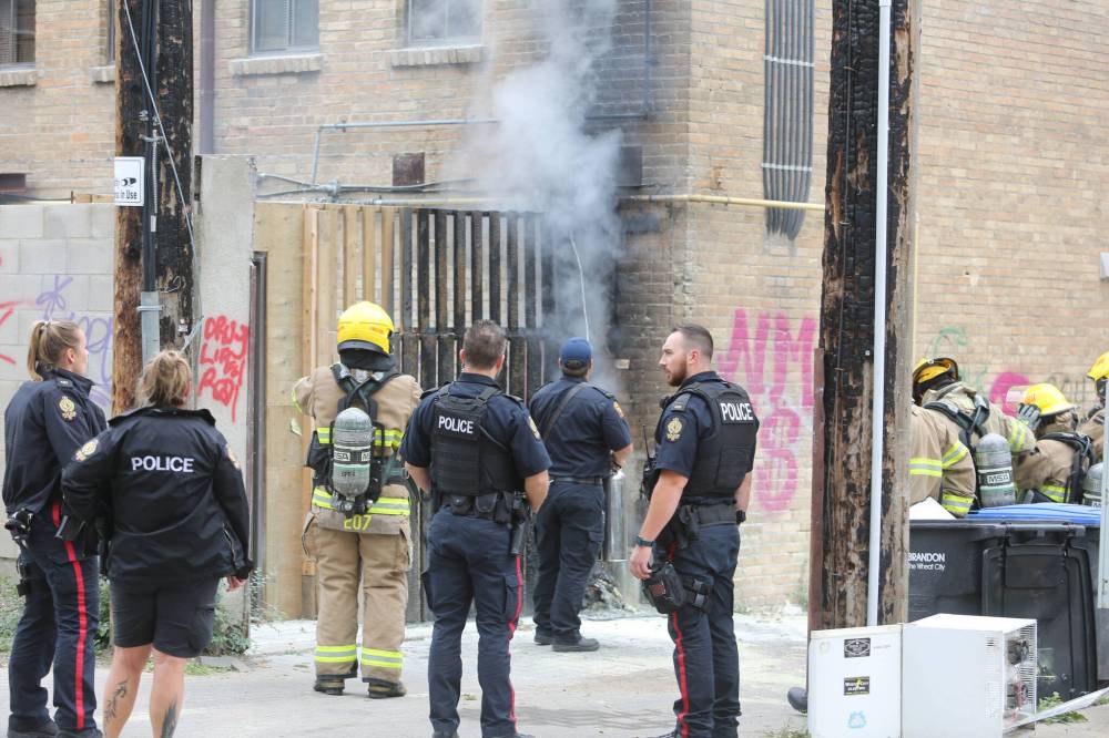 Brandon emergency crew attended the scene of a small fire on the south side of the brick Laplont Block building in the city’s downtown on Wednesday afternoon. When the Sun arrived on scene, fire fighters were spreading out the remains of burning rubbish on the ground, and taking down a burned wooden gate attached to the building.