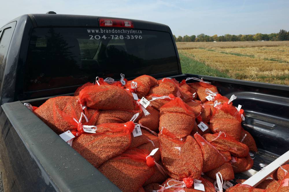 Bags of harvested barley that will be tested and analyzed for yield sit in the back of a pickup truck.
