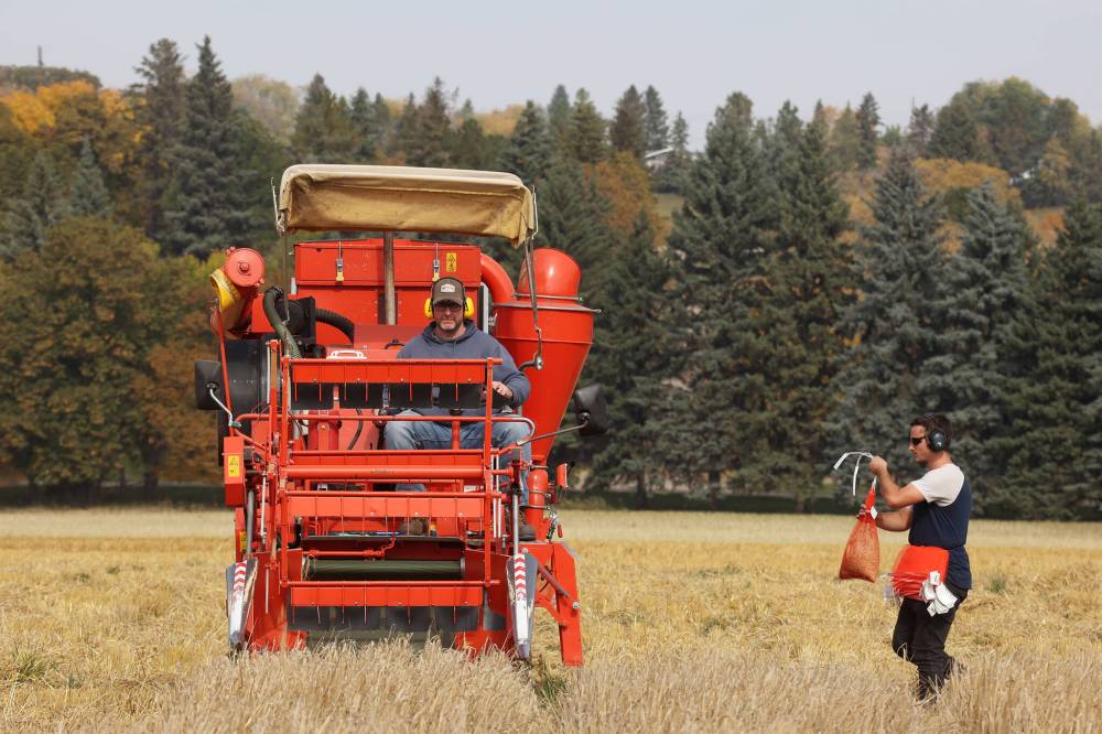 Research assistant Bryan Graham operates a research combine as field operations worker Davis Placatka ties bags of harvested barley seed during Thursday's harvest of barley plots.