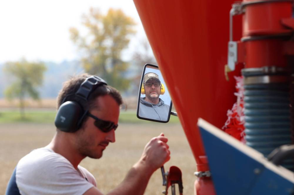 Research technicians Shelby Zatylny and Loni Powell have a discussion while harvesting and collecting barley.
