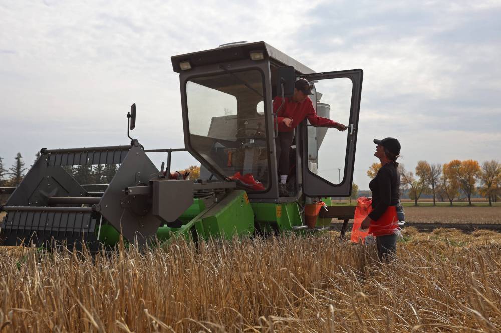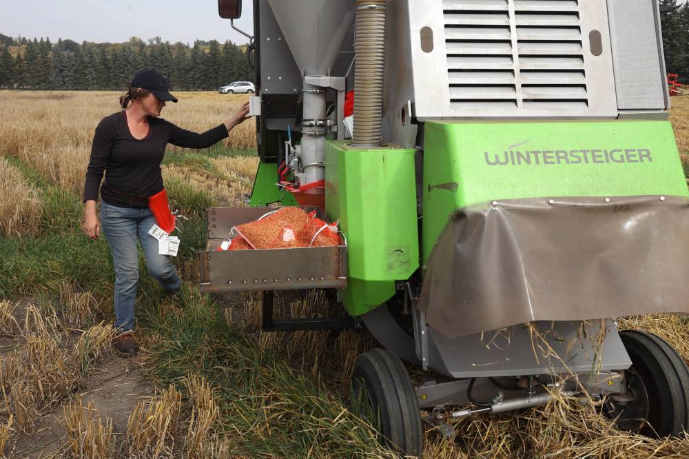 Loni Powell, a research technician with the Brandon Research and Development Centre, collects barley from harvested barley plots in bags as part of the BRDC barley breeding program on a warm Thursday.